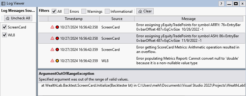 But the problem is hard to reproduce. It works most of the time, but some of the time it causes my custom ScoreCard, ScreenCard, to throw errors. In addition, PlotTimeSeries(Backtester.EquityCurve,...) sometimes (but not always) fails to plot it when this happens. I'm thinking it's somehow dependent on the strategy circumstances itself. I find it's happening on some stocks but not others, so it's data and trading dependent.