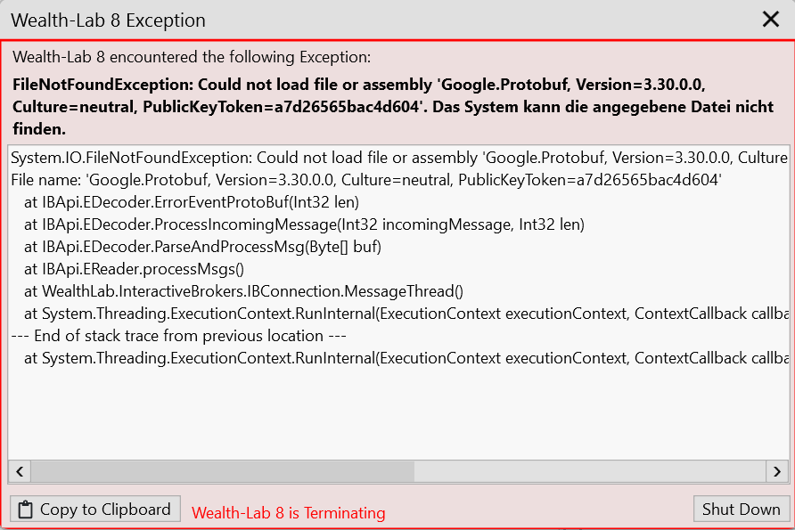 After updating to B152, WealthLab crashes when connecting to IB with the following error message: