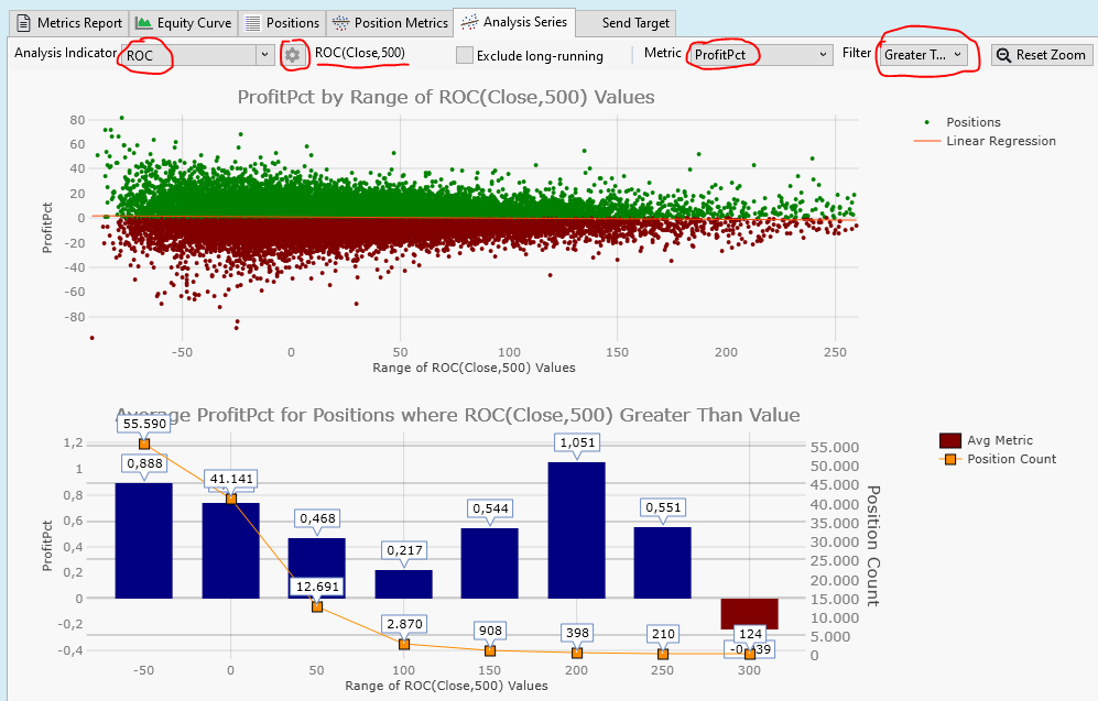 The left Y-Axis shows the average profit, the blue bars are the average profit of the filtered trades. For examle: If we enter trades if the ROC is greater than 50% the blue bar at position "50" has a height of 0,468%, which is the average profit of all the trades entered if ROC(500) > 50%