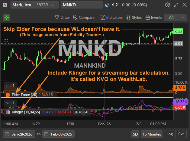 I will! From the screenshot below, you can skip Elder Force because WL doesn't have that one. And that indicator is very similar to Klinger already. Please add streaming bar calculations for Klinger, which is called KVO on WL. Also add the MoneyFlowOscillator by Vitali Apirine. I like that one better than Klinger, but Fidelity Trader+ doesn't have that one.