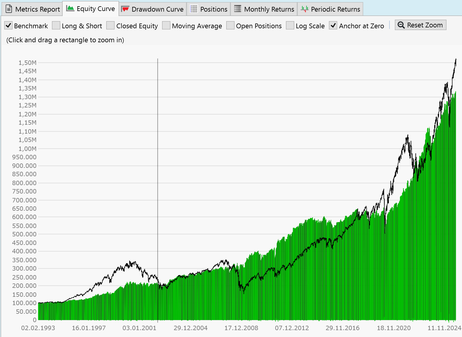 From the two equity curve screenshots I noticed that in the first screenshot by anderson the DD started in 2000 was conquered sometime in 2005. In the second screenshot by vk, a new ATH was reached in sometime in 2003 or early 2004. Given that this strategy only holds positions a few days on average, what could be the reason behind this difference?
