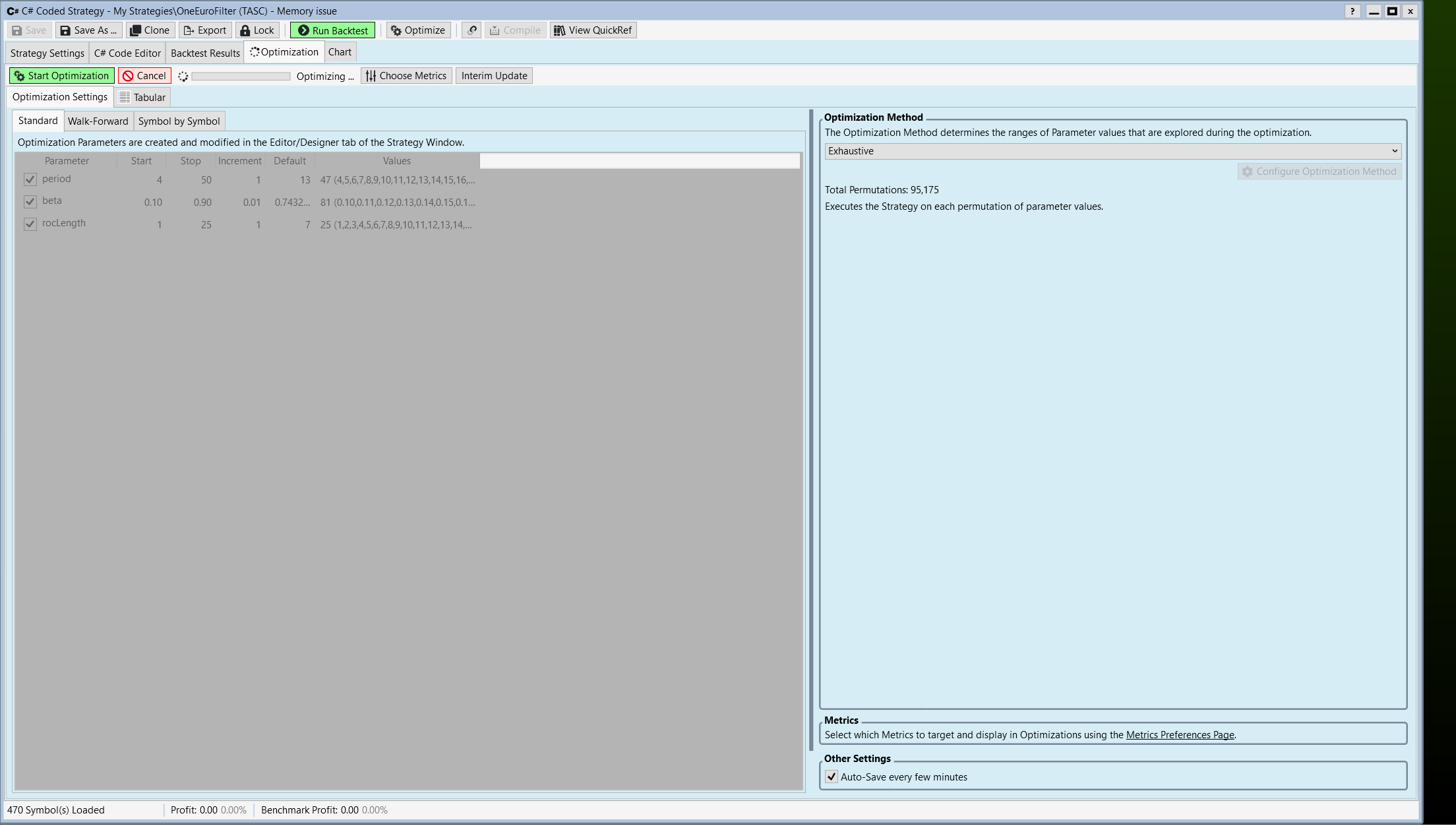 I looked at the OneEuroFilter code and it looks squeaky clean. In any case, you are using Series calls for OneEuroFilter and ROC. And, for exhaustive optimization, you've got over 95,000 permutations. The Series calls end up caching the resulting TimeSeries for each permutation. Hence, the memory is just going to keep going up and up and up. So, you might want to change those Series calls to use new (constructor). Of course there are trade-offs. Using new will cause many recalculations, and some more garbage collection, but less overall memory use (I tested it). I don't know what the impact of the overall time is because I didn't want to let it run for 17 hours. :)