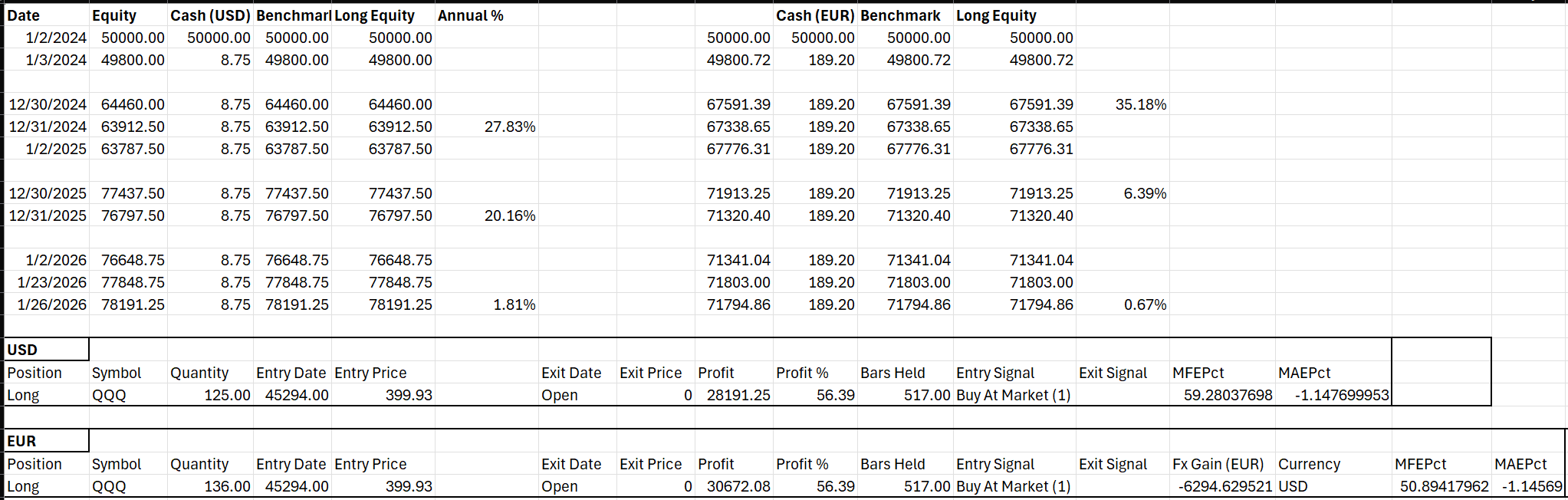 Here's the effect on a 2-year Buy & Hold (QQQ) backtest starting on 1/1/2024, comparing the difference between USD and a EUR backtest.