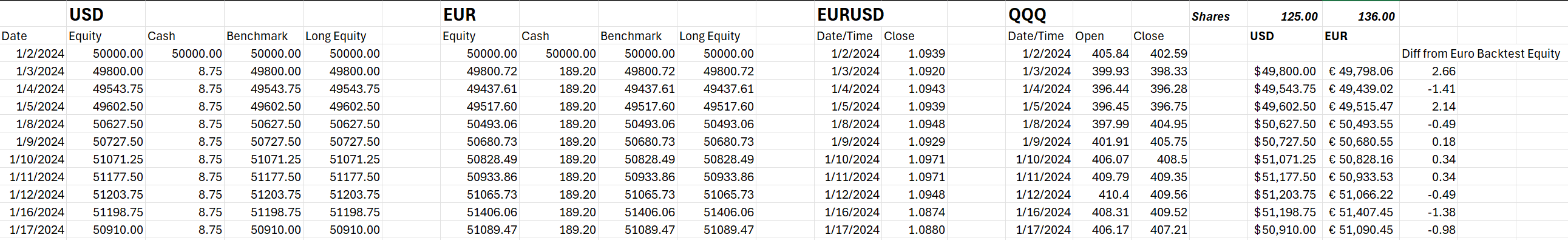 The EUR backtest equity is shares x price / exchange rate + cash, giving a value in Euros. There was a small difference (right-most column) that I can't reconcile at the moment (it could just be a precision issue), but in general it appears that the calculation is correct.