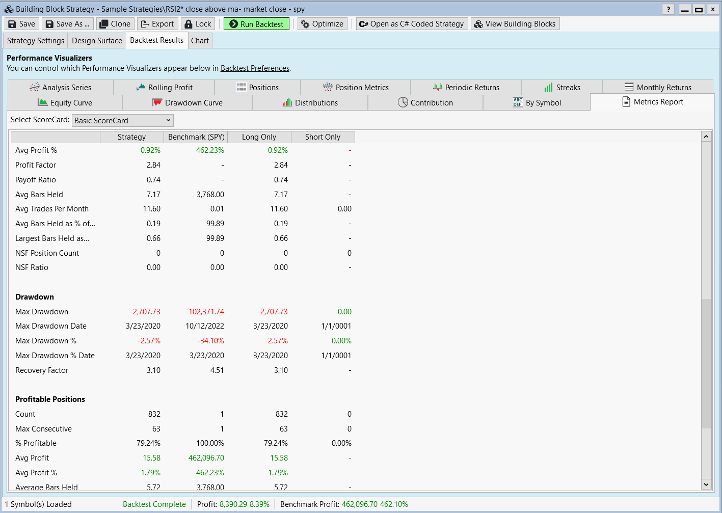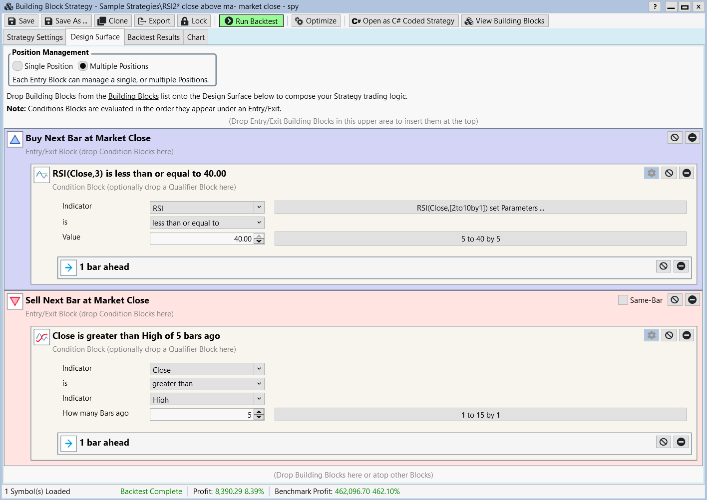 @anderson, to fine tune your results, would you want to set up parameters for Wealthlab to optimize your parameters? I guess your set up is pretty simple (daily bars, RSI <40 buy SPY, sell after 5 days, though I think you need at least one more exit criterium in case your bullish thesis was incorrect), so not much to optimize, especially if you are planning on using options and don't want too much theta decay depending on your expiration choice. I think that's one way that WL8 excels.