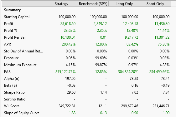 The back test gives the following, but in real trading I don't get filled with auto-trading and have to use the buy/sell/short/cover buttons on the live chart and manually adjust on the Interactive Broker trading window. Once I do that, then I"m manually trading and the limit/stop algorithm will not reflect the correct entry. Also, sometimes the position size gets out of sync if there are partial trades.