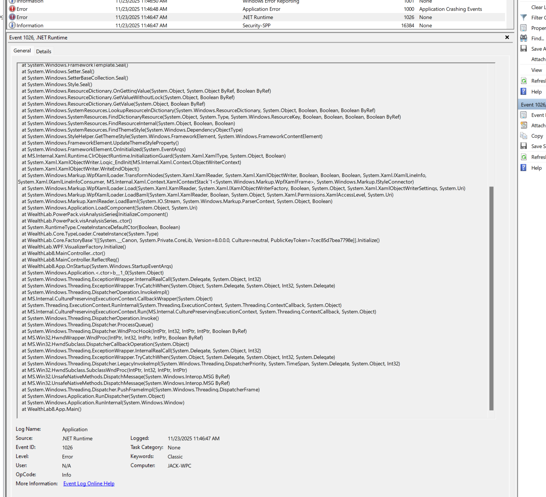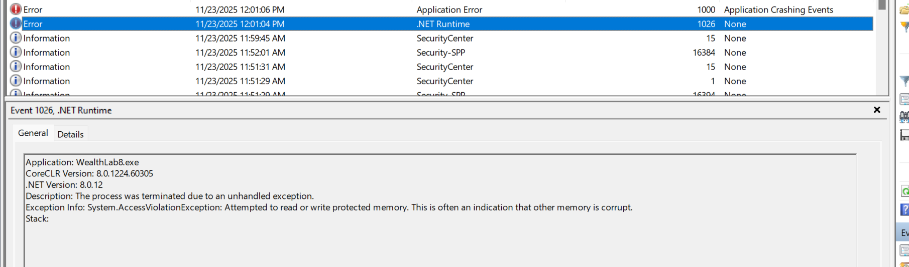 I updated to the newest version of WL one of two days ago, and my Windows desktop restarted last night and had some updates installed. Today WealthLab randomly crashes for a few times (Sometime it crashed while starting, and sometime it crashed while i worked on strategy backtesting). I was able to find the following crash logs from Windows events. Seems there were slightly different for different crash instances . Could the WL developers take a look? Thanks.