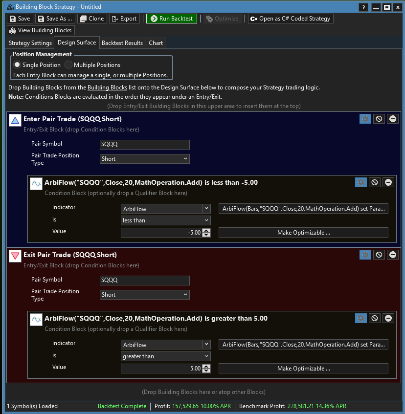 - Pair Entry and Pair Exit Building Blocks that automatically enters a pair trade on a secondary symbol when the Block's Condition is satisfied.