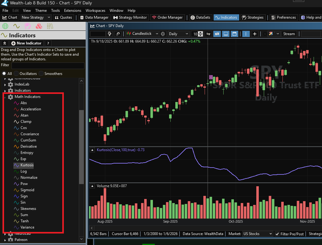 The Pure Math extension adds a collection of low-level mathematical, statistical, and signal-processing Indicators to WealthLab. These tools are designed as composable elements, not trading systems, giving advanced users the freedom to construct custom indicators, transformations, and models with full control and transparency.