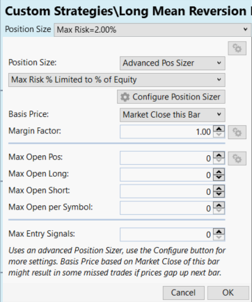 Only the second strategy lists the correct position sizer. The other three are stuck on "Max % Risk". However, if I then select the "Max % Risk", I see this: