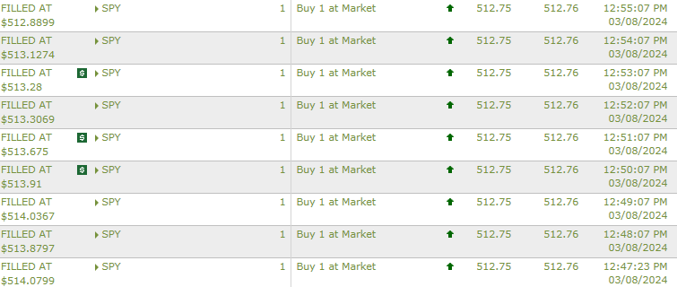03/08/24 9:50:07 AM SPY Filled Filled 1 at 513.91 : BUY 1 SPY at MARKET Day FillID: 1380MVR4348322911 1380MVR4