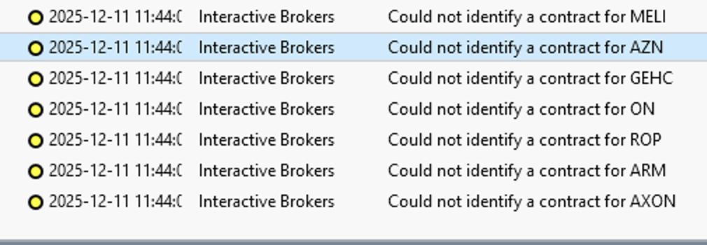 Here are the log messages from IB - these are part of the ND100 dataset I dragged into a quotes window. What can I do to get data for them? ( and any others that go missing in the future.)