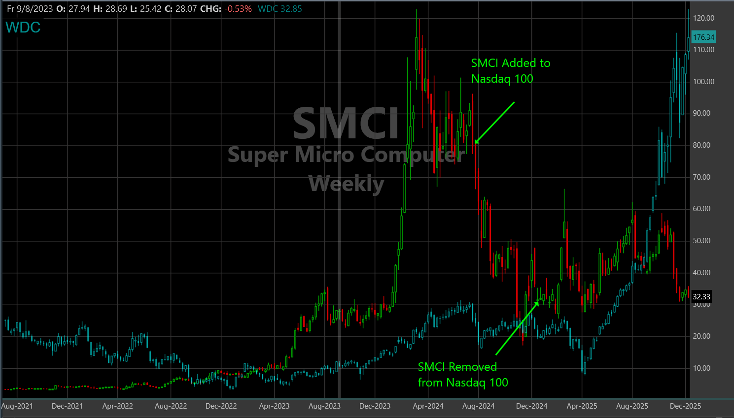 Now they decide to add these two same-industry, highly correlated, 1-year hockey-stick return companies to the Nasdaq 100.