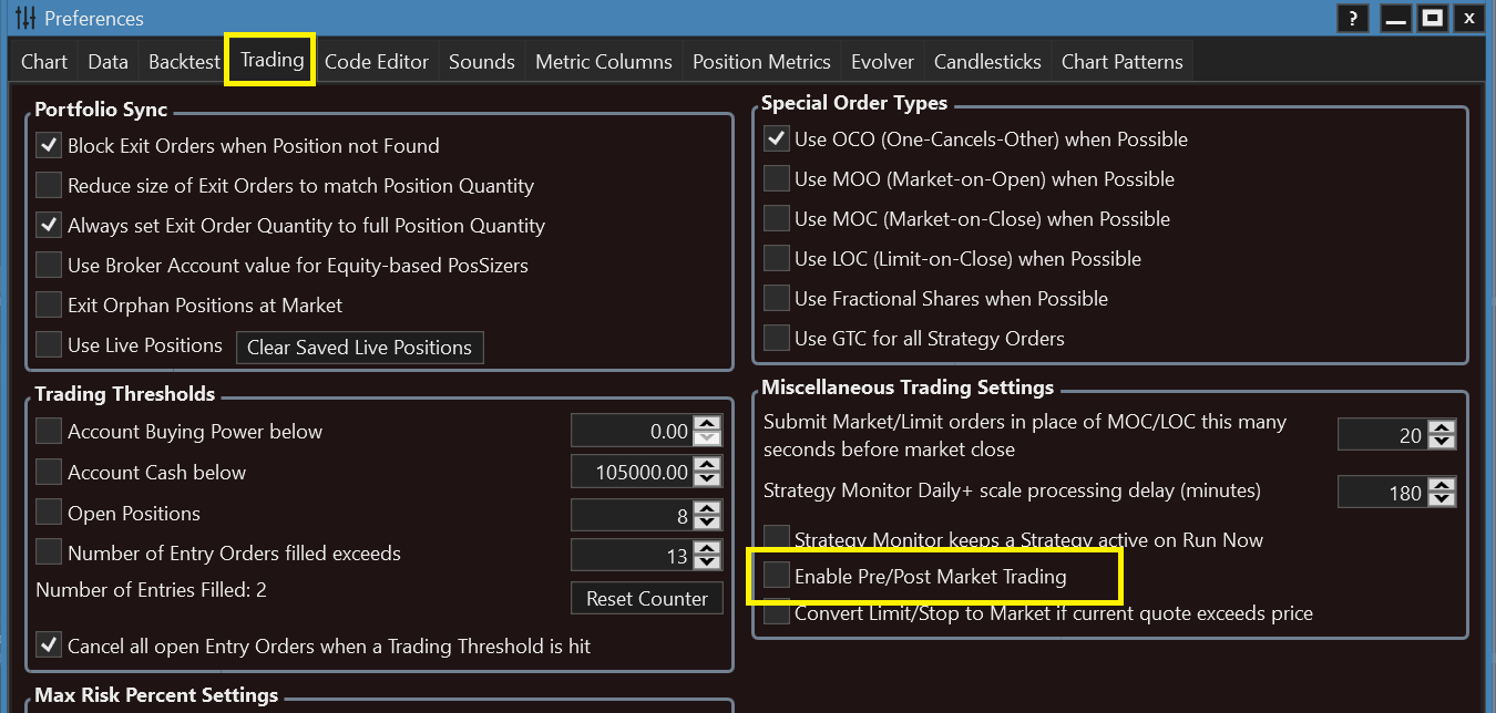I'm talking about WealthLab's Trading Preference. If "Pre/Post" is enabled, WealthLab will mark Stop and Limit orders to execute in the Pre/Post market. You don't want that to happen, so disable this as shown: