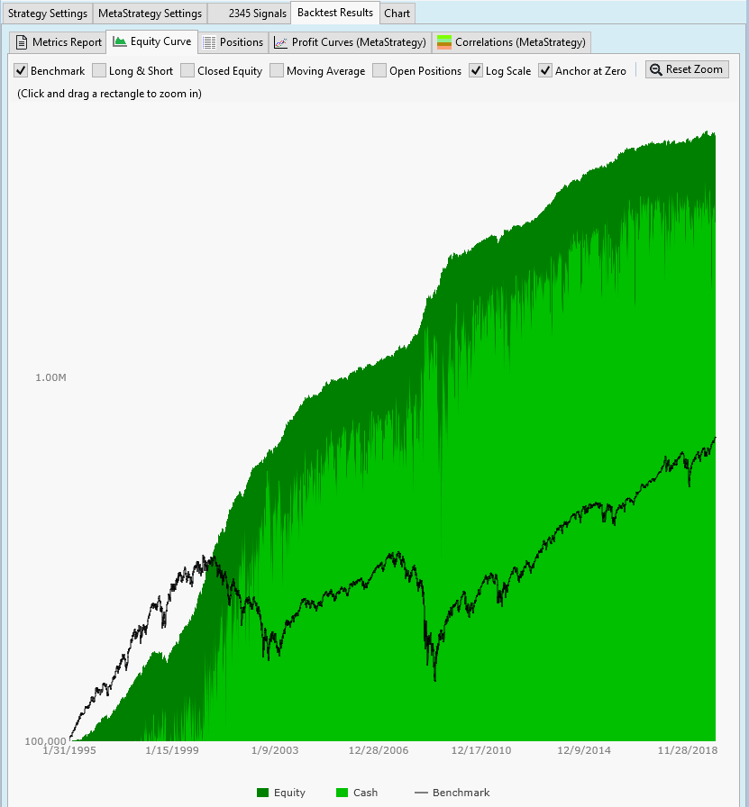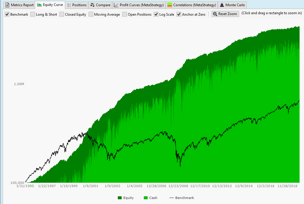 It's kind of interesting that everything just keeps going up! I was going to infer the obvious - using the broader stock universe as originally suggested by Bensdorp / DrKoch yields better results, but the differences between the meta-strategy window and the solo-strategy results seem to be problematic (like maybe there's a bug in how the data-sources are being cached and handled between strategy windows?)