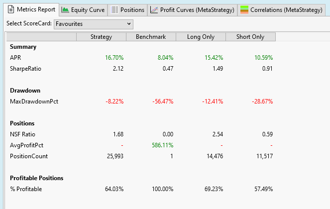which ended up in roughly 20000 symbols. This is not anywhere near the universe of Bensdorp but should be close enough in my opinion. Next step was to take exactly (except for Norgate's MajorExchangeListedTimeSeries time series)the strategies as they come with WL, e.g.