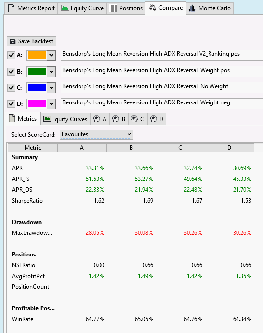 I vote we remove the Weights for published strategies using limit orders for more realistic results. You could then use our Monte Carlo Lab extension to get a true idea of their potential.