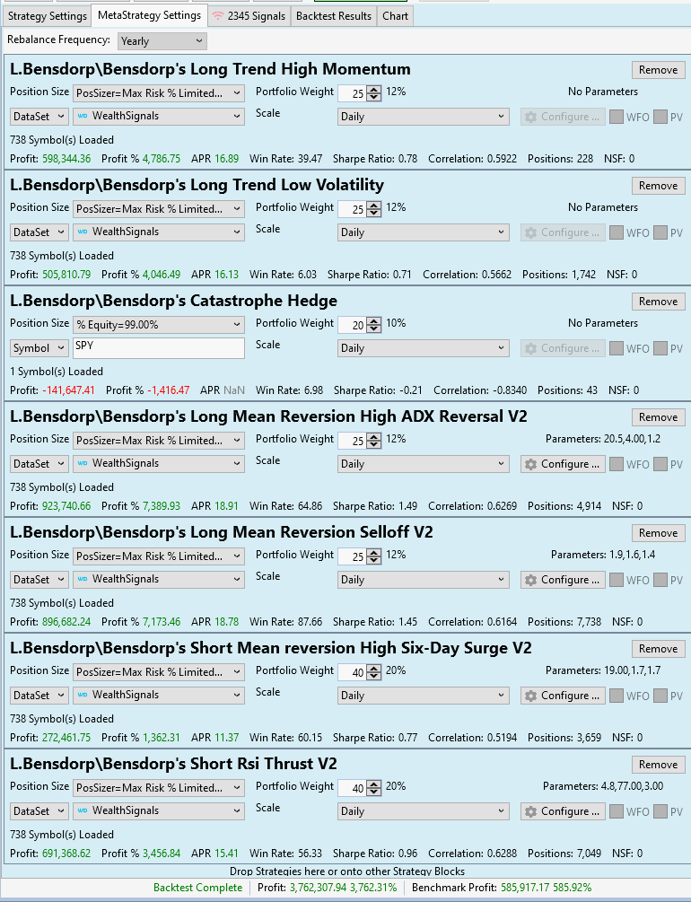 So I adapted the parameters using the SMAC optimizer and the methods mentioned in the "How to address overfitting" forum thread (https://www.wealth-lab.com/Discussion/How-to-address-overfitting-9305) to work for the WealthSignals portfolio (738 symbols).