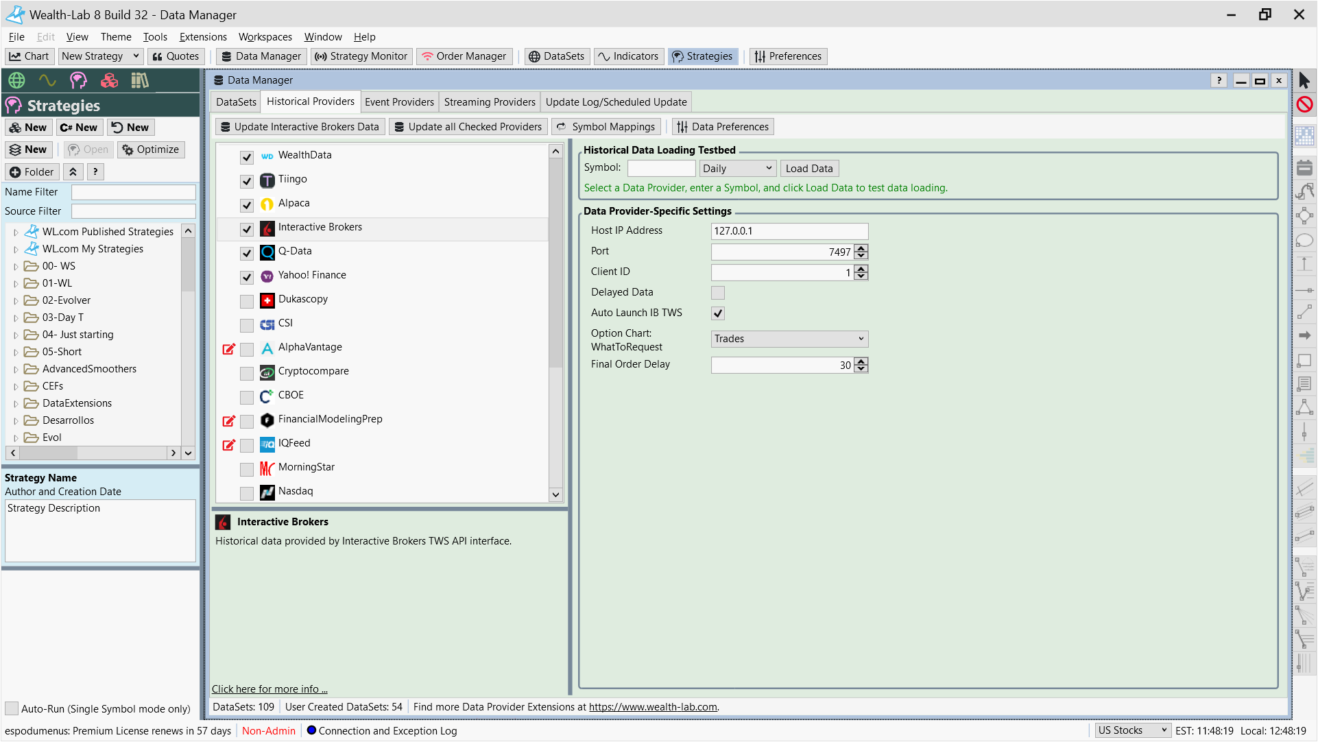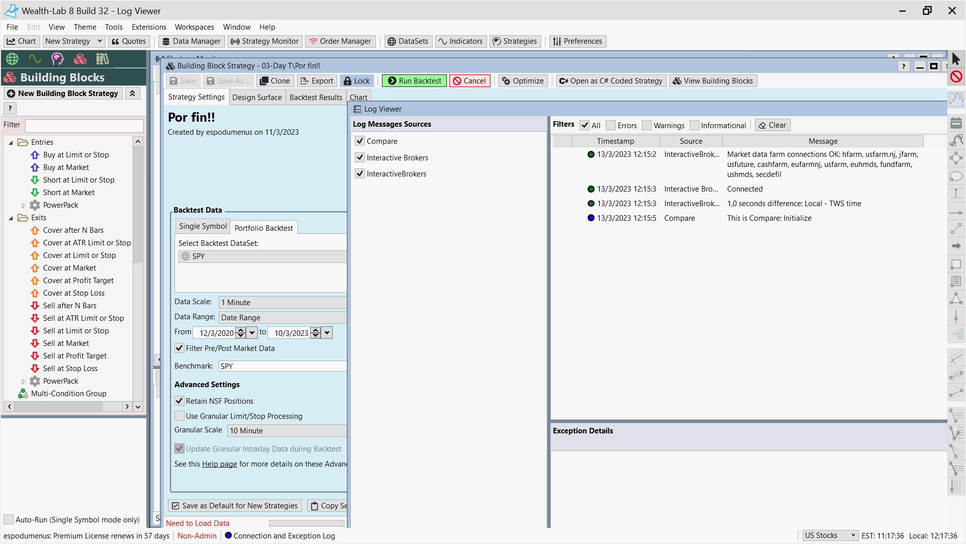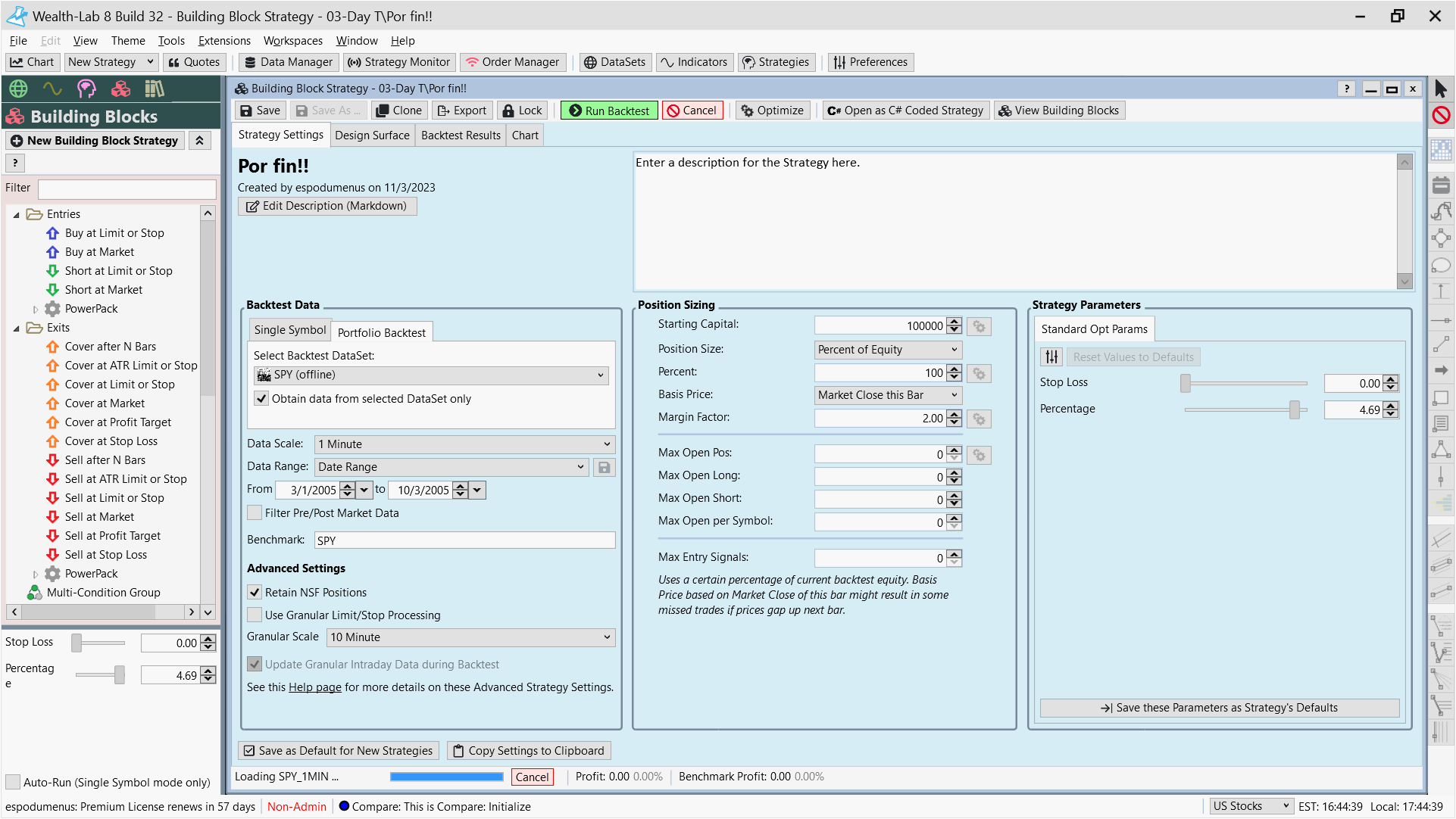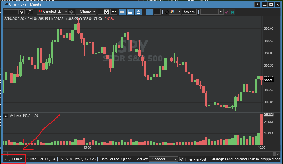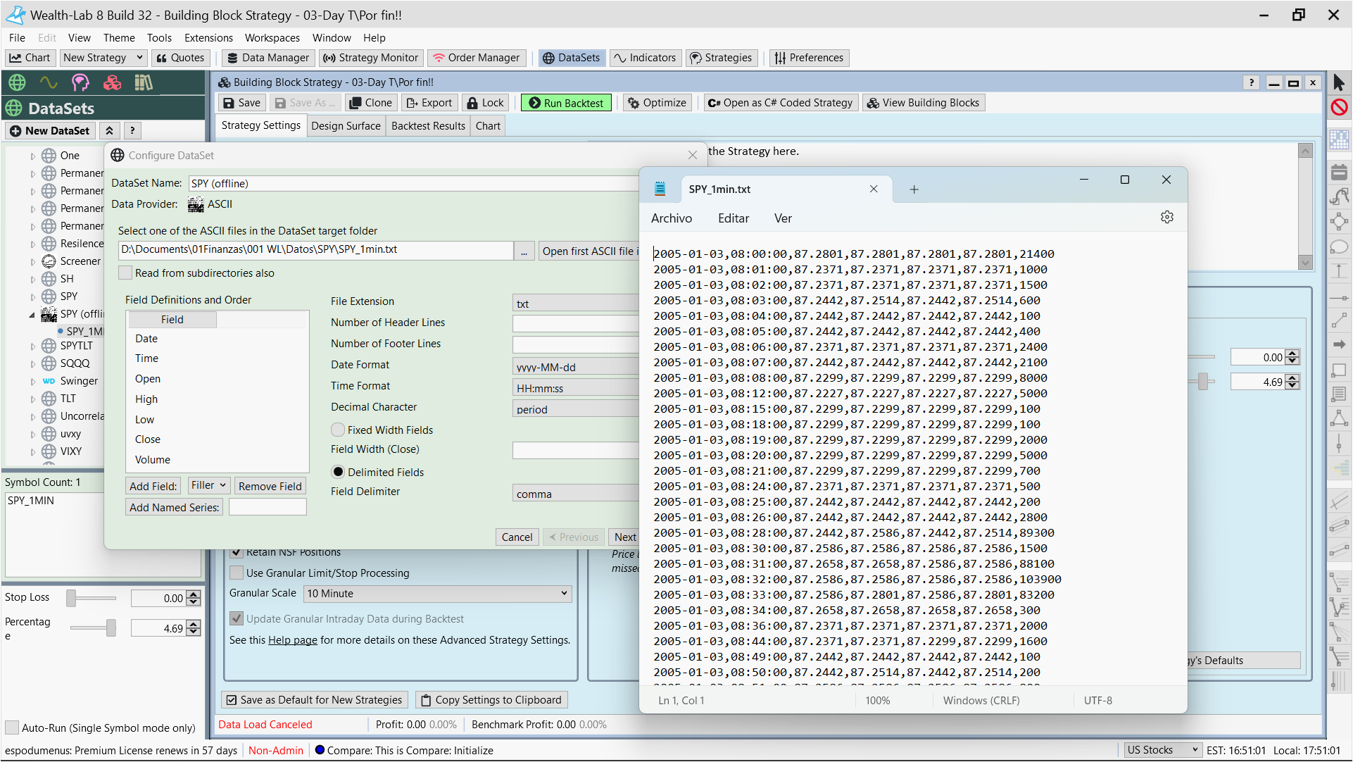 Now I am thinking I failed again and wish I would rather invited my wife to dinner. When I load a data file containing just a couple of days 1 minute bar information, it performs well. Now I am trying to load the entire dataset (SPY, 1 minute bar from 2005 to 2023) and the process bar on the bottom of the screen seems frozen. How long may it take to process this file assuming my hardware complies with the minimum requirements and better?