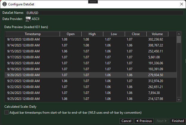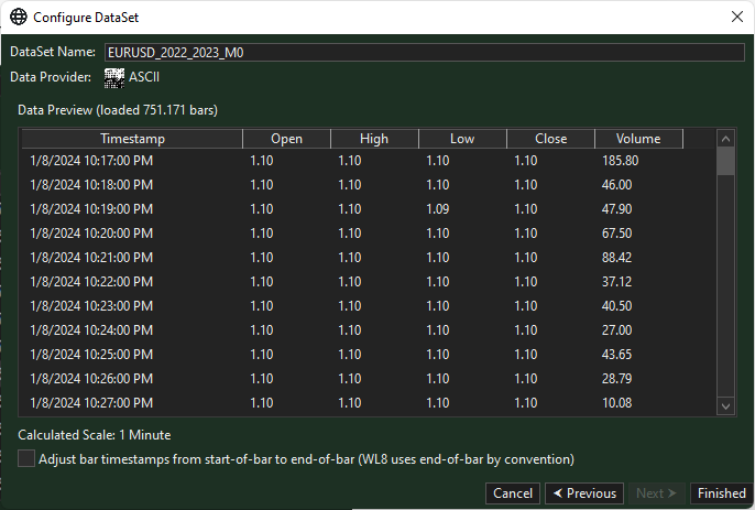 When I use the M1 data imported into WL8 to plot on the 60-minute scale, I do not get the same values for this candle, even when changing the option "Adjust bar timestamps from start-of-bar to end-of-bar".