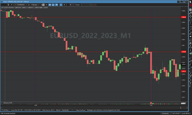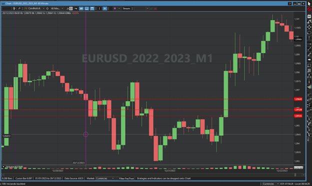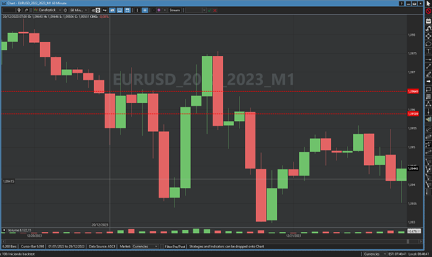 I looked at the OHLC values that would be in the 60-minute candle in the CSV from TickStory between 2023-12-20 06:00:00 and 2023-12-20 06:59:00.