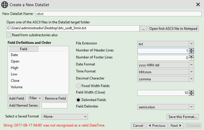 i'm trying to import a bitcoin dataset i've created but i'm getting ando error about the datetime, can you help me with the correct format to import the dataset?