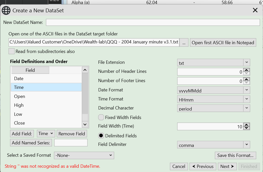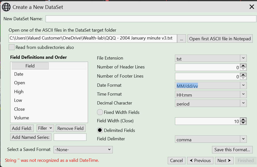 I'm trying to import a data file and I keep getting the error message "String " was not recognized as a valid DateTime". I have tried this with both .csv and .txt formats.