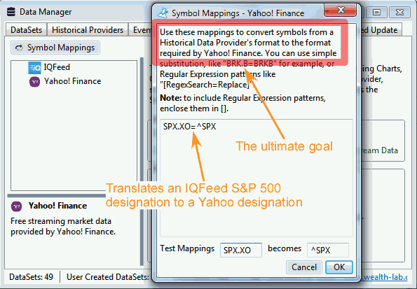Sometimes I need to disable IQFeed which uses SPX.XO to designate the S&P 500. When that happens, I want the S&P 500 lookup to default to the Yahoo provider as ^SPX instead. For Yahoo streaming symbols, I've designated this as shown below.