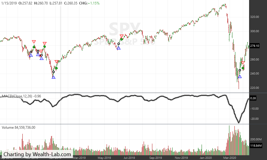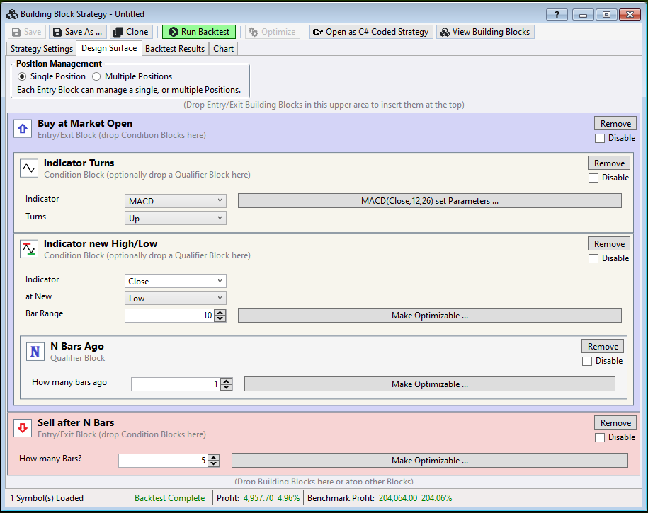 To trigger off the MACD mins and max's, use "Indicator Turns" in combination with new High/Low like this -