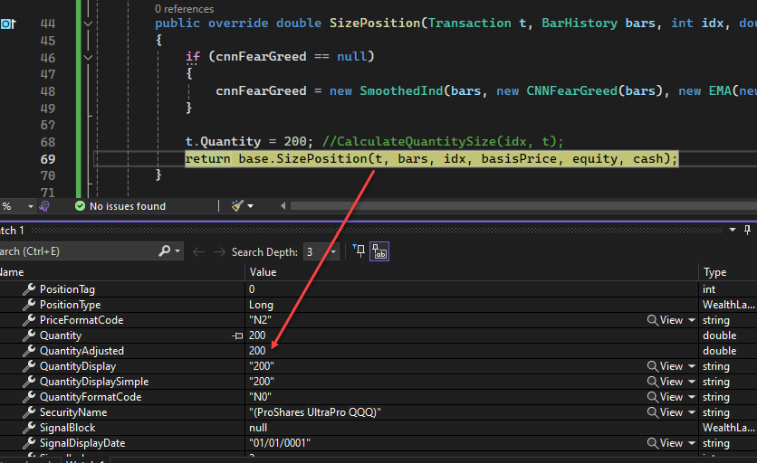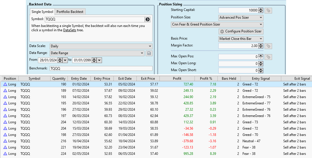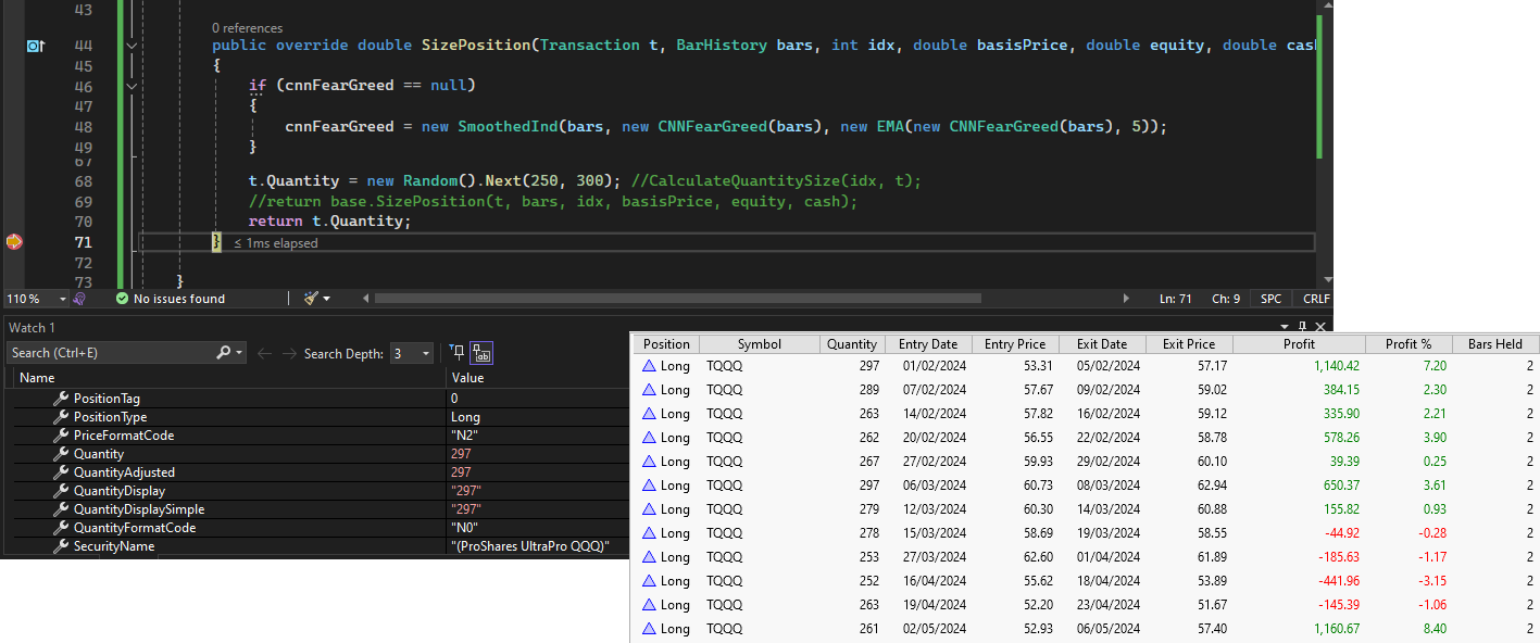 public override double SizePosition(Transaction t, BarHistory bars, int idx, double basisPrice, double equity, double cash) { if (cnnFearGreed == null) { cnnFearGreed = new SmoothedInd(bars, new CNNFearGreed(bars), new EMA(new CNNFearGreed(bars), 5)); } t.Quantity = 200; //CalculateQuantitySize(idx, t); return base.SizePosition(t, bars, idx, basisPrice, equity, cash); } // Trade Rules in Strategy public override void Execute(BarHistory bars, int idx) { Position foundPosition0 = FindOpenPosition(0); if (foundPosition0 == null) { if (ConsecDown.Series(bars.Close, 1)[idx] >= 2.00) { PlaceTrade(bars, TransactionType.Buy, OrderType.Market, 0, 0, ""); } } else { if (idx - foundPosition0.EntryBar + 1 >= 2) { ClosePosition(foundPosition0, OrderType.Market, 0,""); } } }