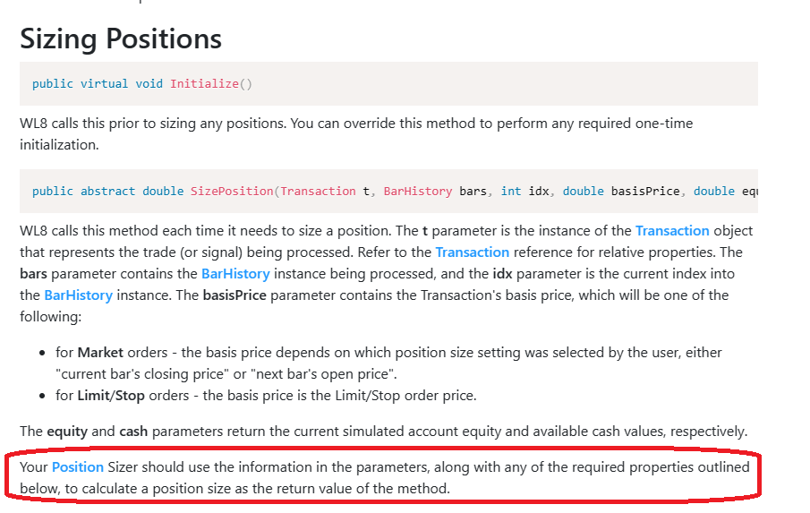 // maximum posSize double maxPosSize = CalculatePositionSize(PositionSizeType.PctOfEquity, maxPct, bars, basisPrice, equity, idx);