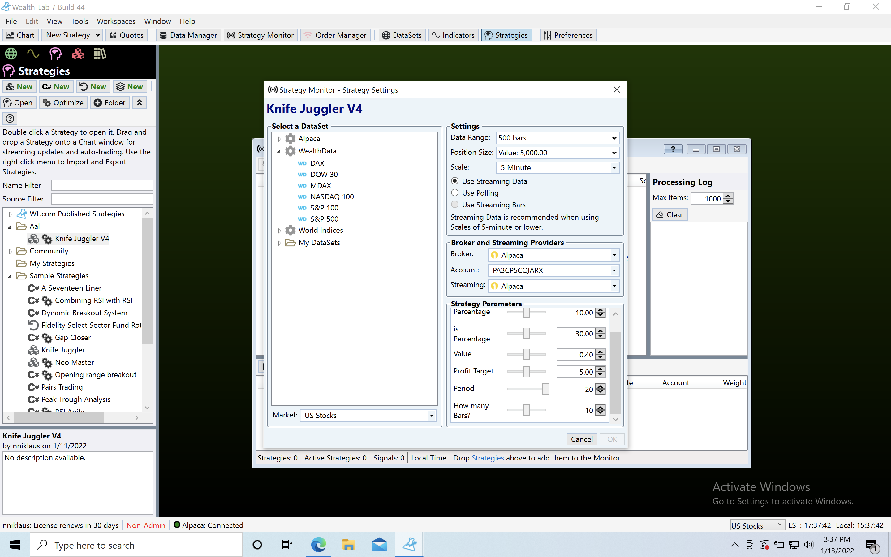 I've been using the chart tool, adding my strategy, streaming from Alpaca and pressing "Auto-Place", but I noticed it only trades within a minute of me selecting these options. Is there a better way to ensure that my algos are executing paper trades all day?