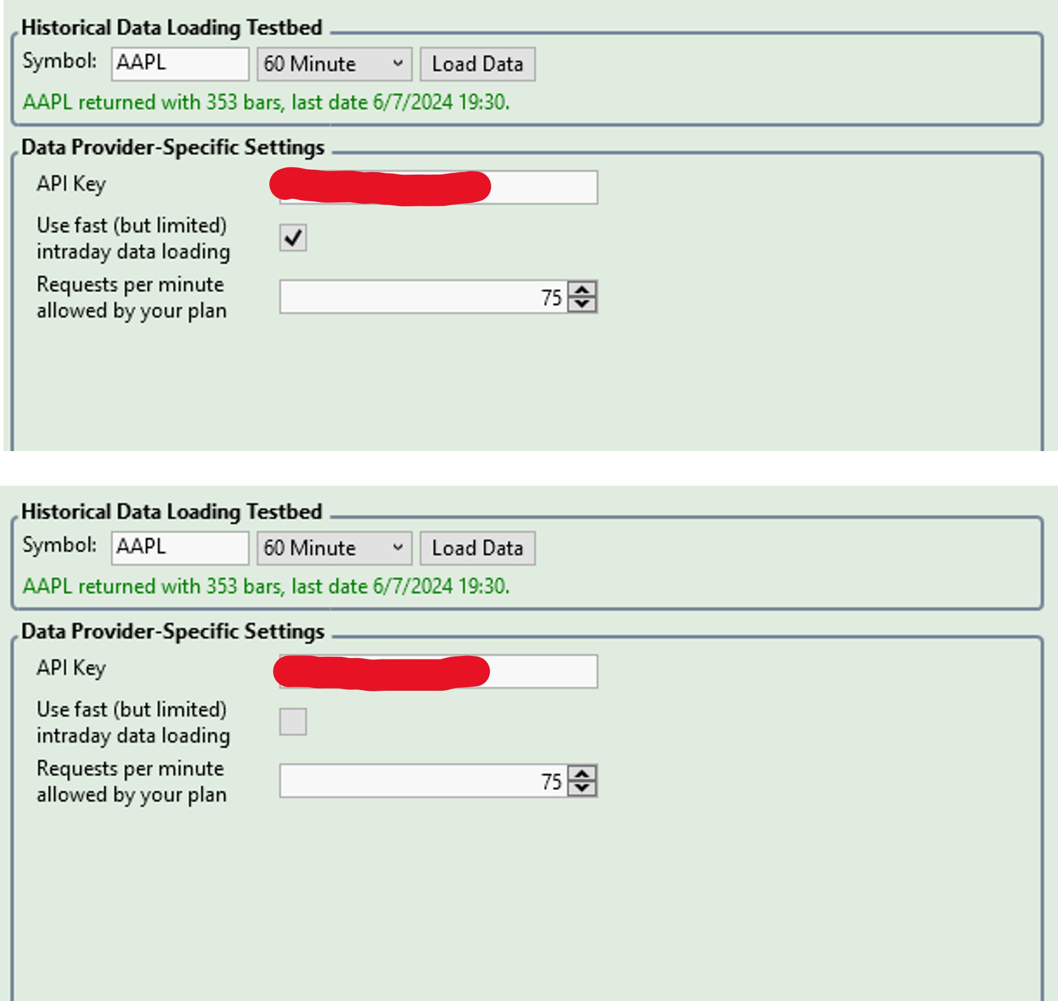 In Historical Data Loading Testbed, loading 60-min data for AAPL is working just fine for Alphavantage with my API key. Can you take a screenshot of it, blurring the API key?