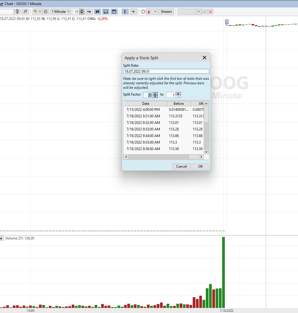 I wanted to manually adjust the 1 minute EODHD intraday data from Google by a stock split of 20:1 (July 18th 2022) .