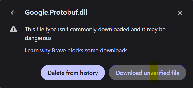 2. Download file to the desktop. As with this Brave browser, you may need to confirm to "Download unverified file" since it's a dll.