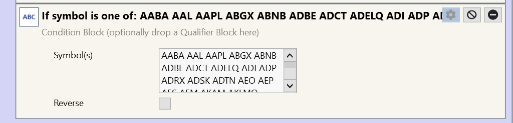 I have created a strategy that includes a regime switch. I want to trade one side of the switch e.g. in the S&P 100 and the other side of the switch e.g. in the Nasdaq 100. To do this, I have merged the data from the S&P 100 and NQ100 via the order manager. I have now completed the first regime (NQ100). I used the "Symbol Filter" building block for this. I have copied the shares of the NQ100 into it: