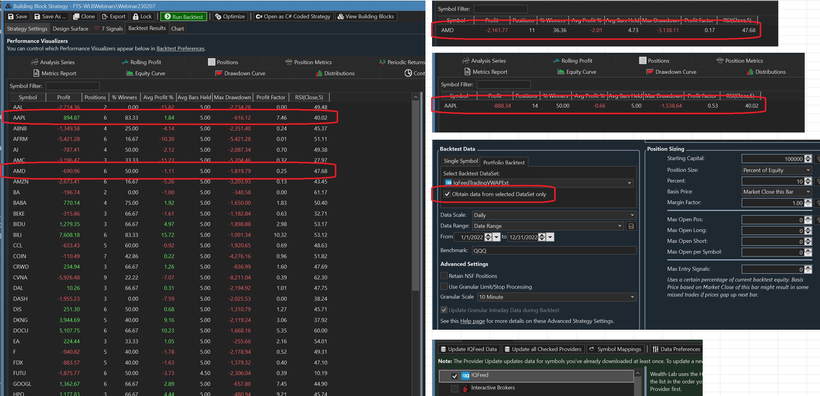 I am backtesting a portfolio of symbols but when comparing to Single Symbol backtest the results don't match. Maybe a portfolio setting? I have the same strategy, settings and data provider for both. (Obtain data from selected DataSet only ON) IQfeed for both. See image for symbol comparison and settings below. This happens for all symbols in portfolio. Please advice. Thanks.