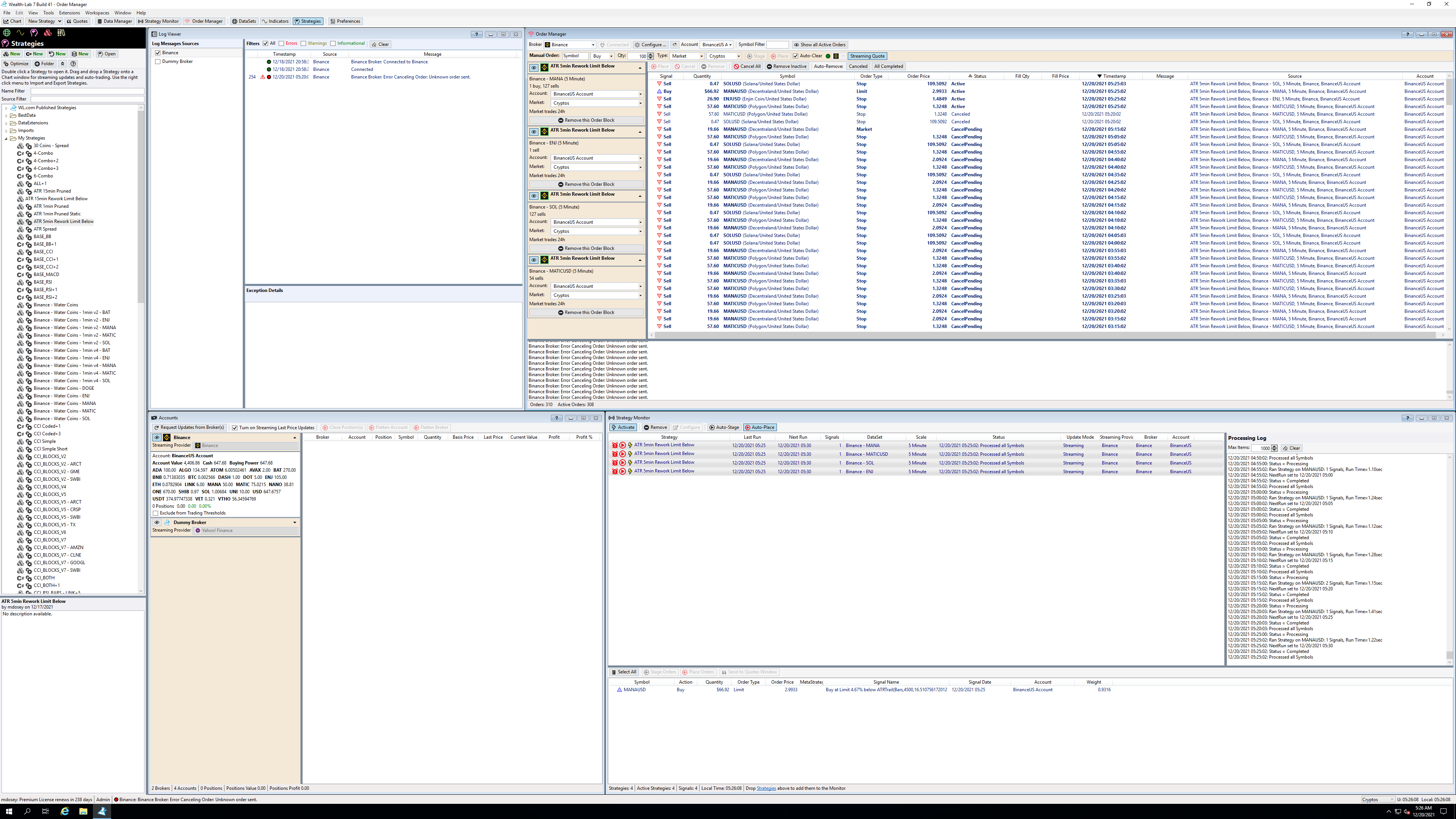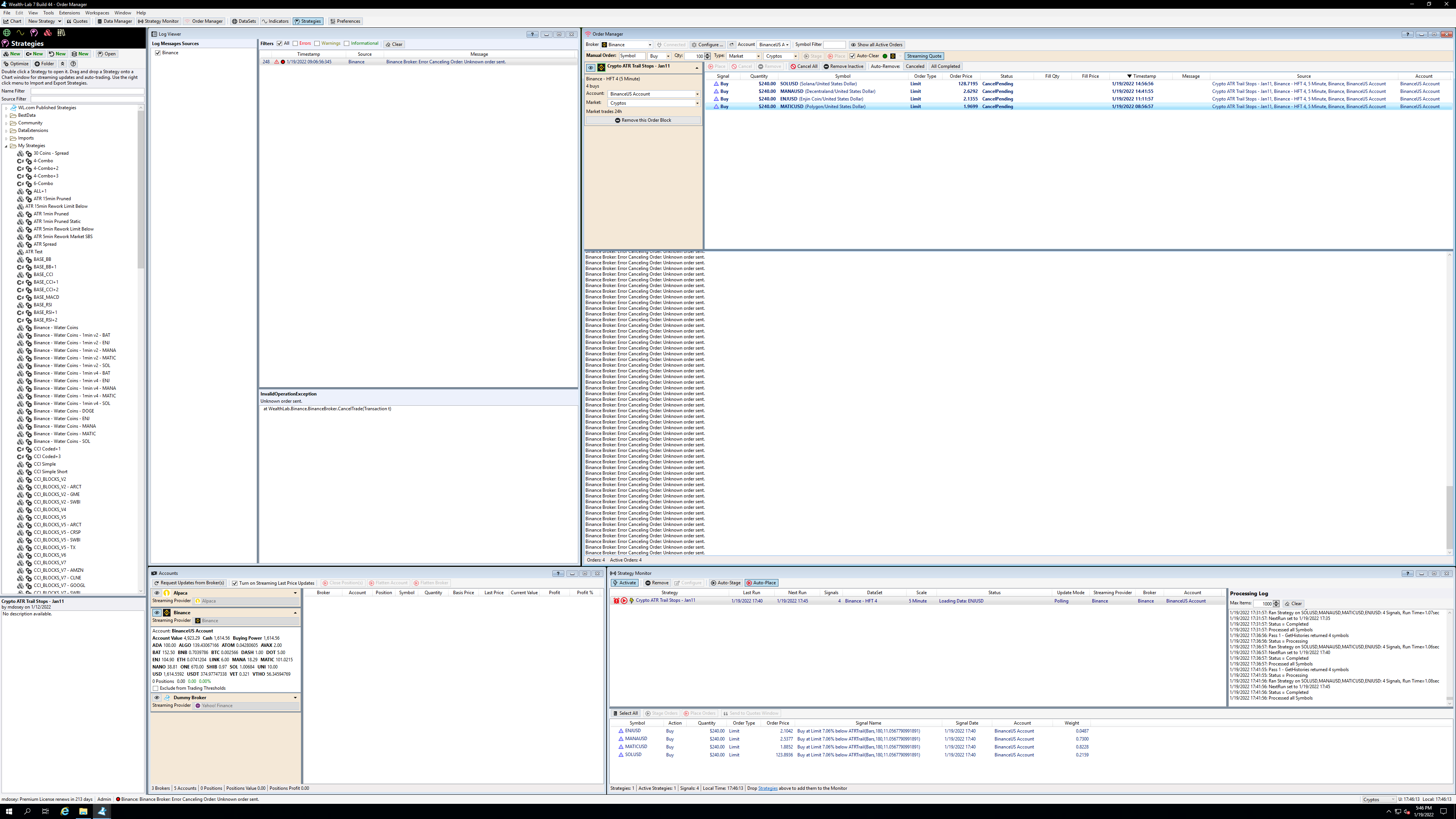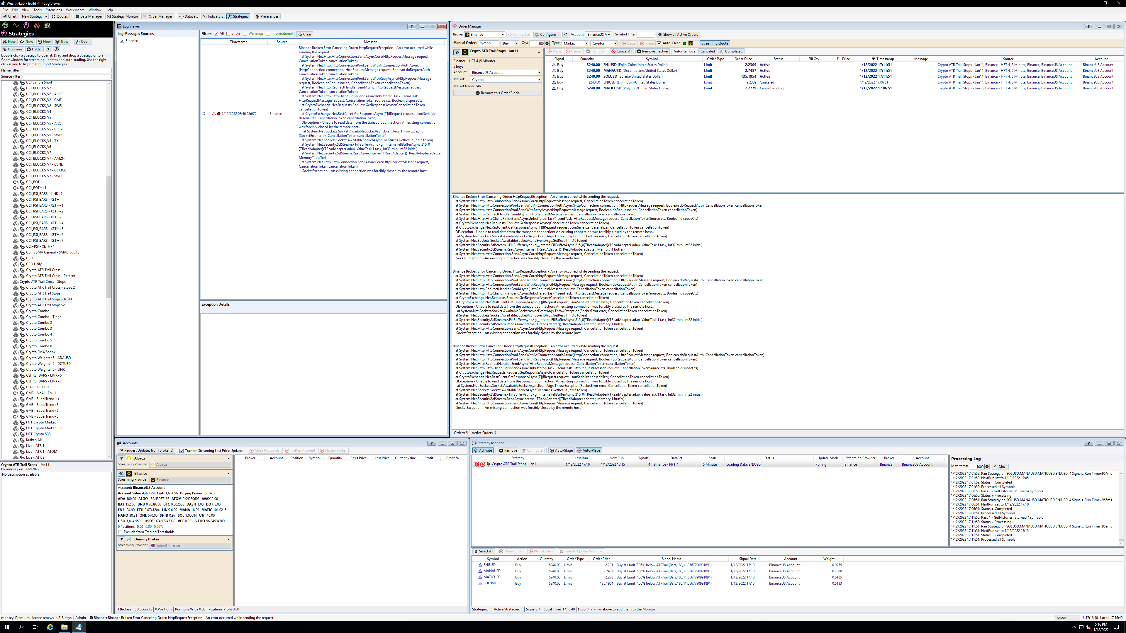 I let the strategy keep running for a while to see if it would eventually correct itself, but I do believe it was fully stuck and non-functioning at that point. You can see in this image that the timestamps in the Order Manager are hours behind the timestamp in the bottom right of the WL7 window. When the strategy is working, the timestamps in the Order Manager were updating every 5 minutes.