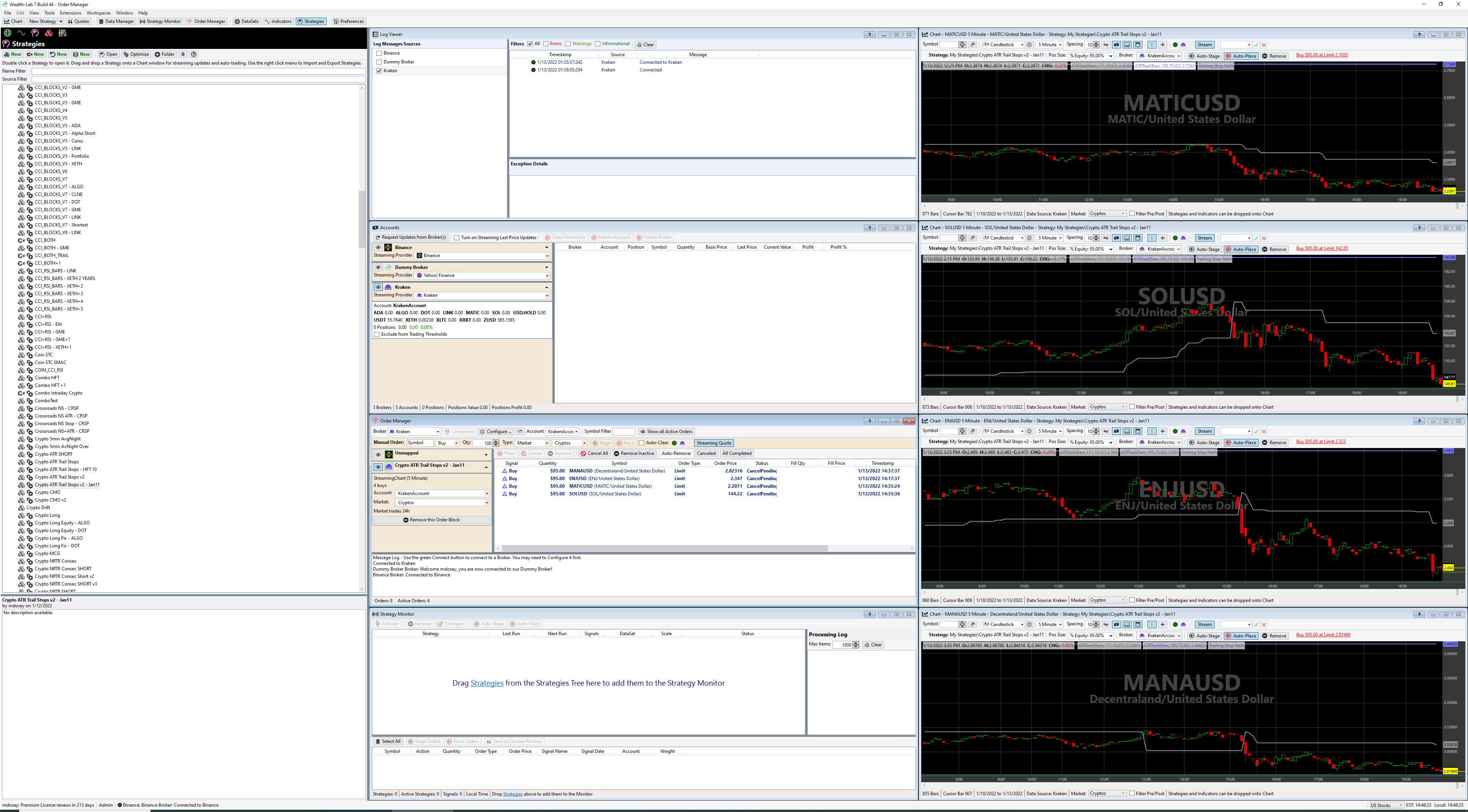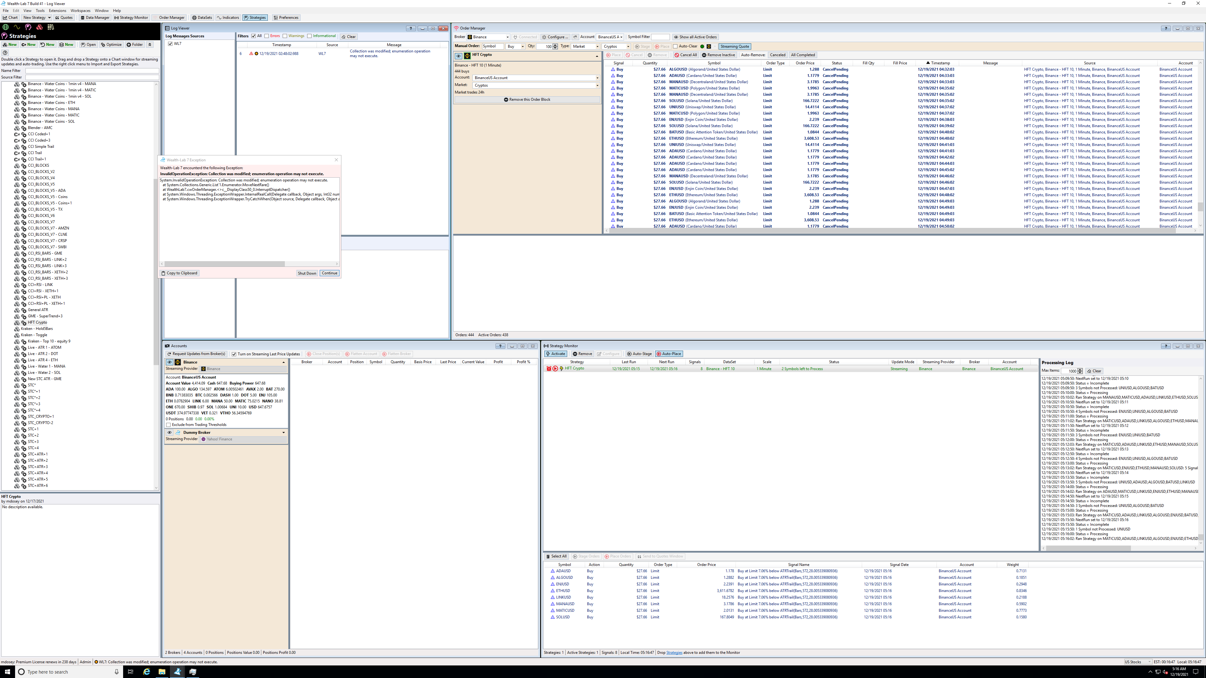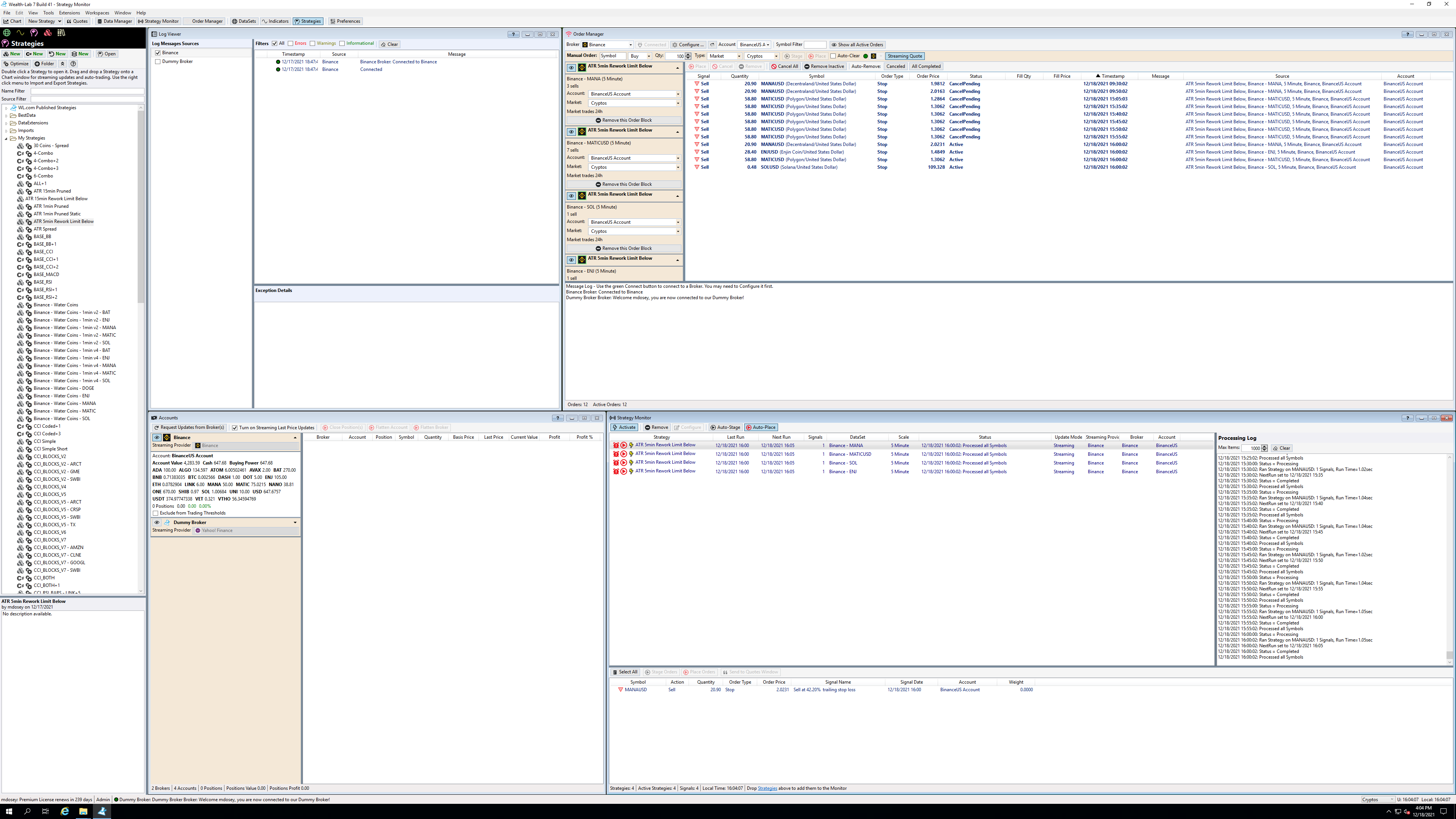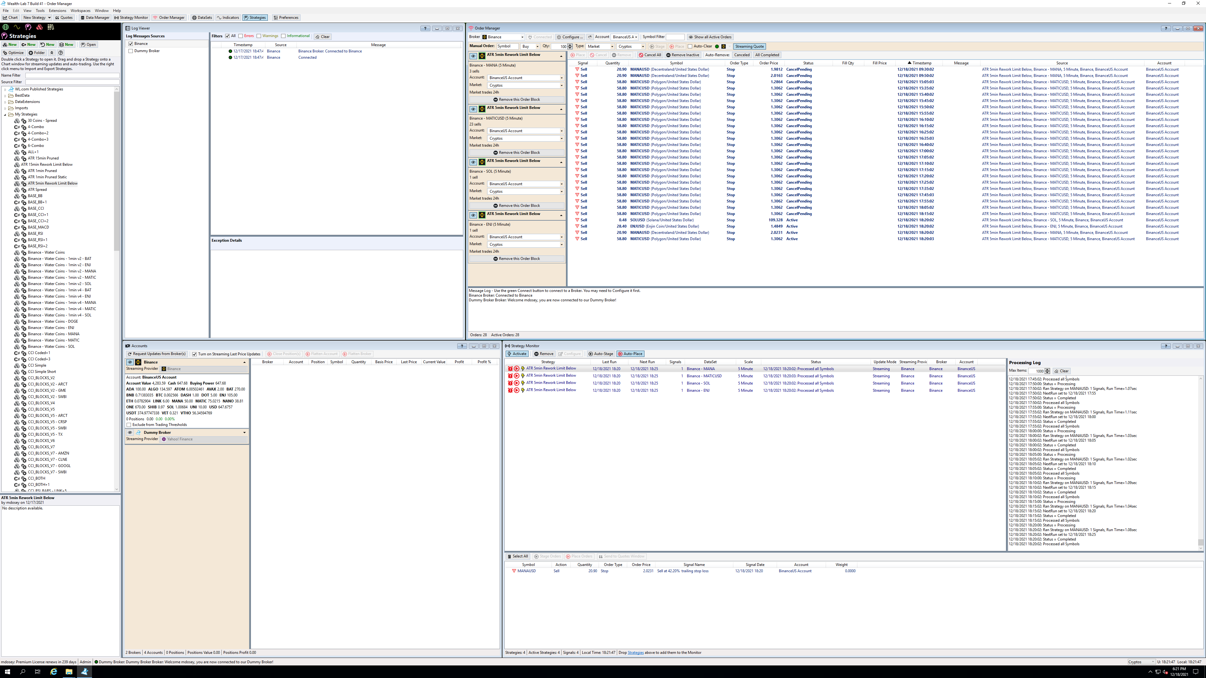 I let the strategy keep running for a while to see if it would eventually correct itself, but I do believe it was fully stuck and non-functioning at that point. You can see in this image that the timestamps in the Order Manager are hours behind the timestamp in the bottom right of the WL7 window. When the strategy is working, the timestamps in the Order Manager were updating every 5 minutes.