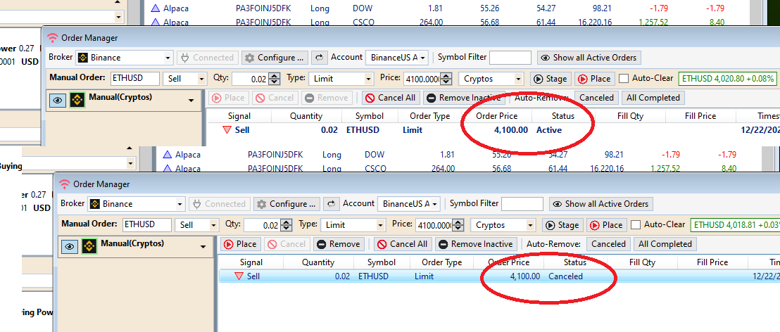 - An OCO sell order that has one part of it filled will not have both parts marked as filled by WealthLab, even though the unfilled part will be canceled in Binance. The part that wasn't triggered will then get switched to CancelPending status, where it sits indefinitely. E.g. with an OCO take profit + stop loss order, if the take profit is filled, the stop loss gets marked as CancelPending. This case happens every time an OCO sell order is filled.