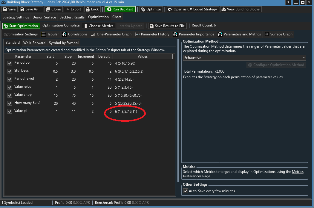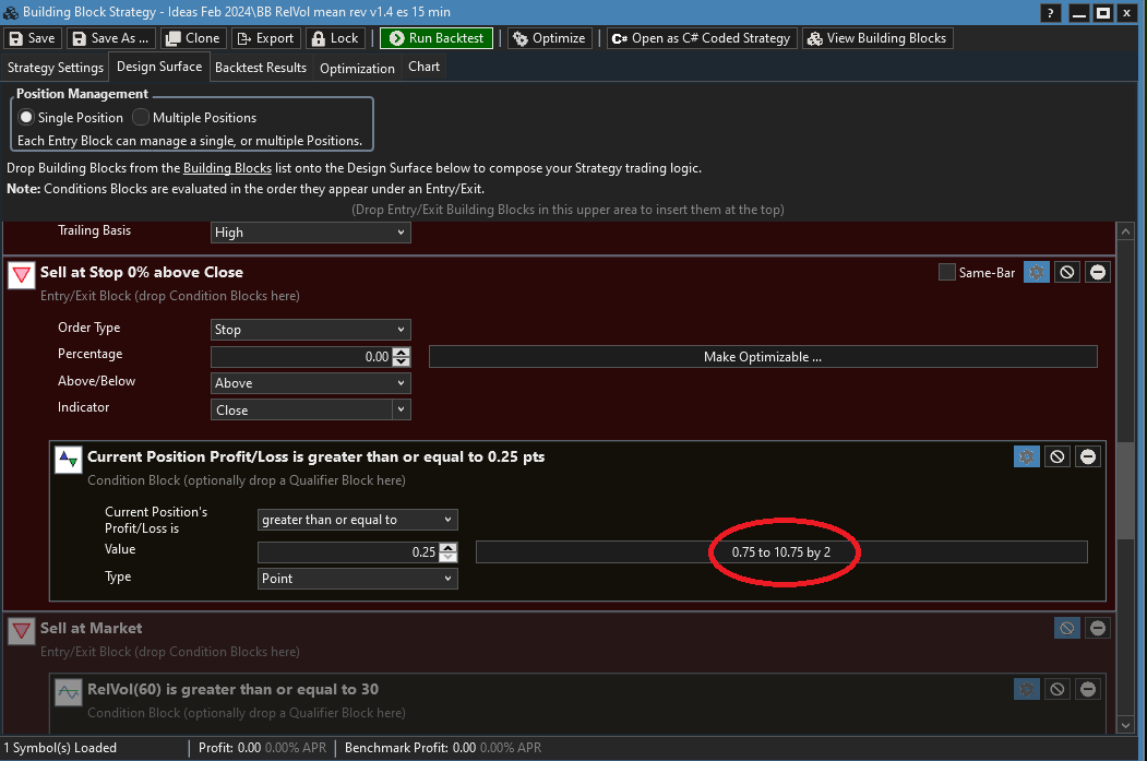 I was working on a block strategy and when I attempted to make a parameter start at a decimal but increase by an integer it would not create the correct interval for what I was setting it for. In the example below, I wanted it to start at "0.75" points and then increase by 2 full points to the stop value, but it would only use full integers and not decimals. I wanted the intervals to be (0.75, 2.75, 4.75, 6.75, 8.75, and 10.75) but instead they showed up as (1,3,5,7,9,11).
