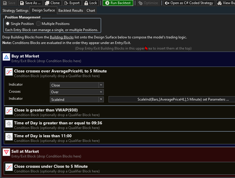 Edit the strategy by changing just the ScaledInd indicator as follows (change the ScaledInd indicator for Close to AveragePriceHL. Although, you could use any of the basic prices (i.e. Low, High, etc.):