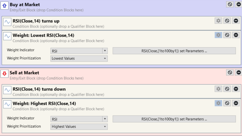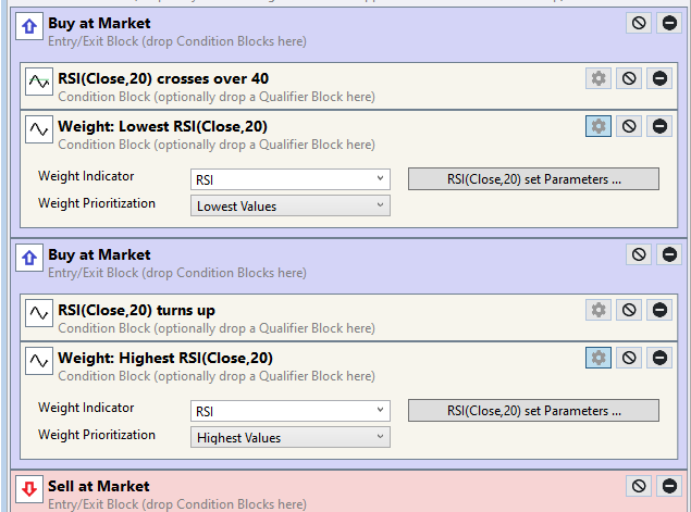 It doesn't really matter what the indicators are, but in a situation like the one pictured is that all the signals are sorted by the Weight value. It's clear that for the bottom conditions, weights will go from 0 to 100 and the higher values will have more priority.
