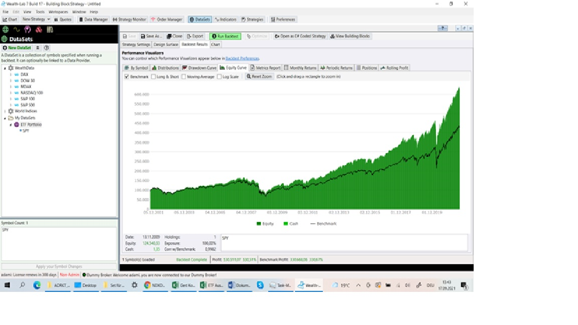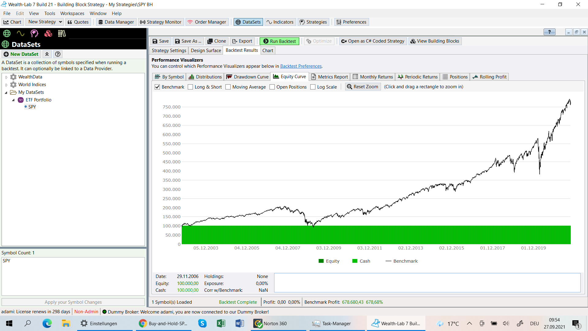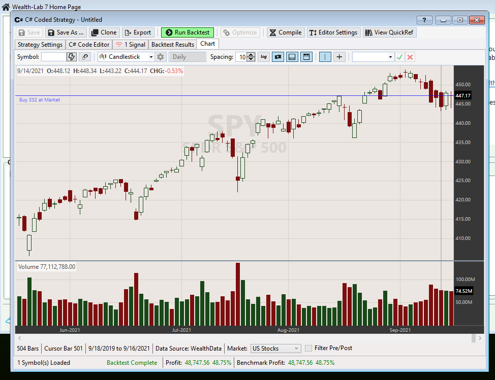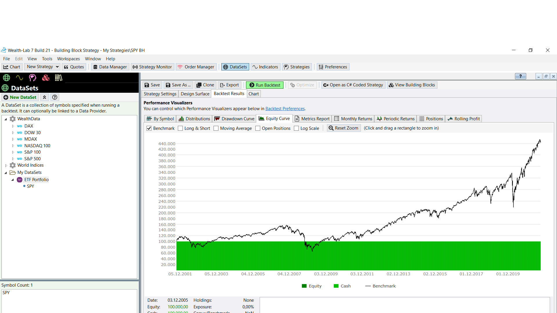 I use the full history of SPY from Yahoo and use building blocks with just buy market.
