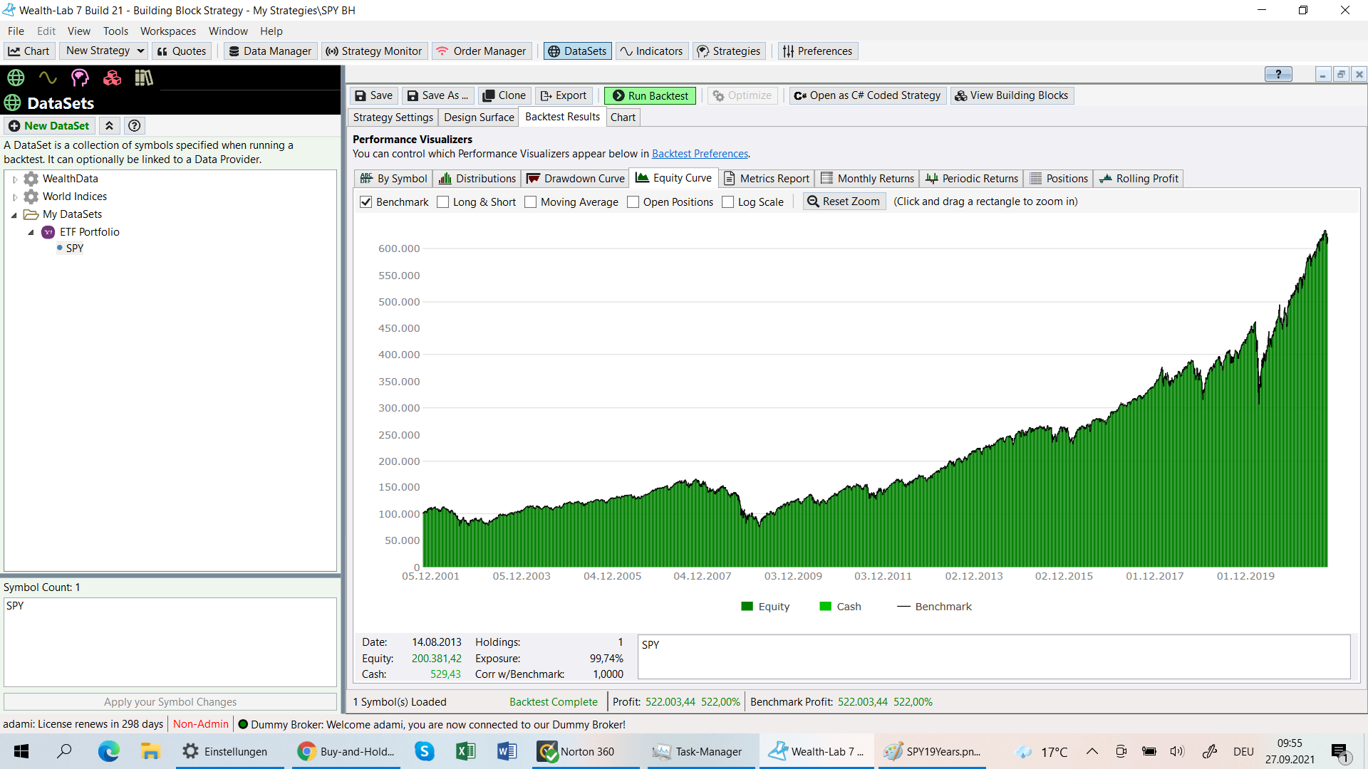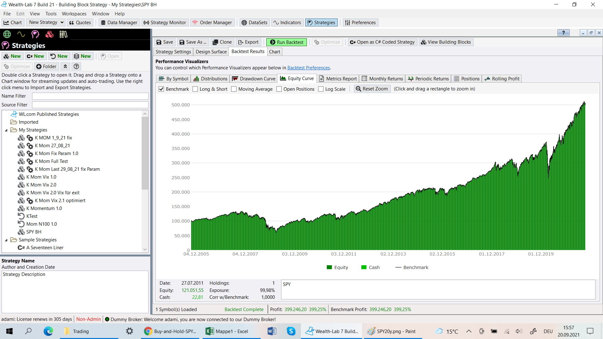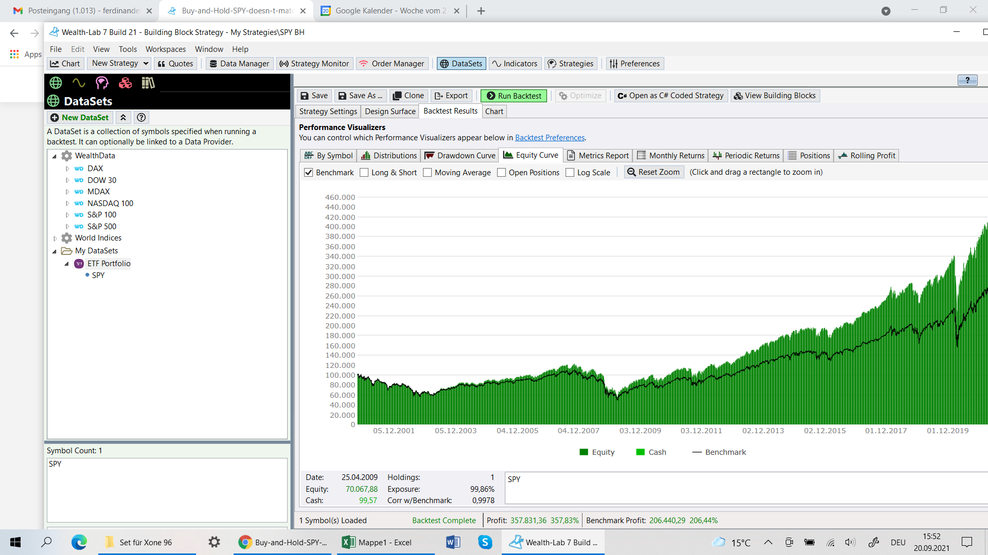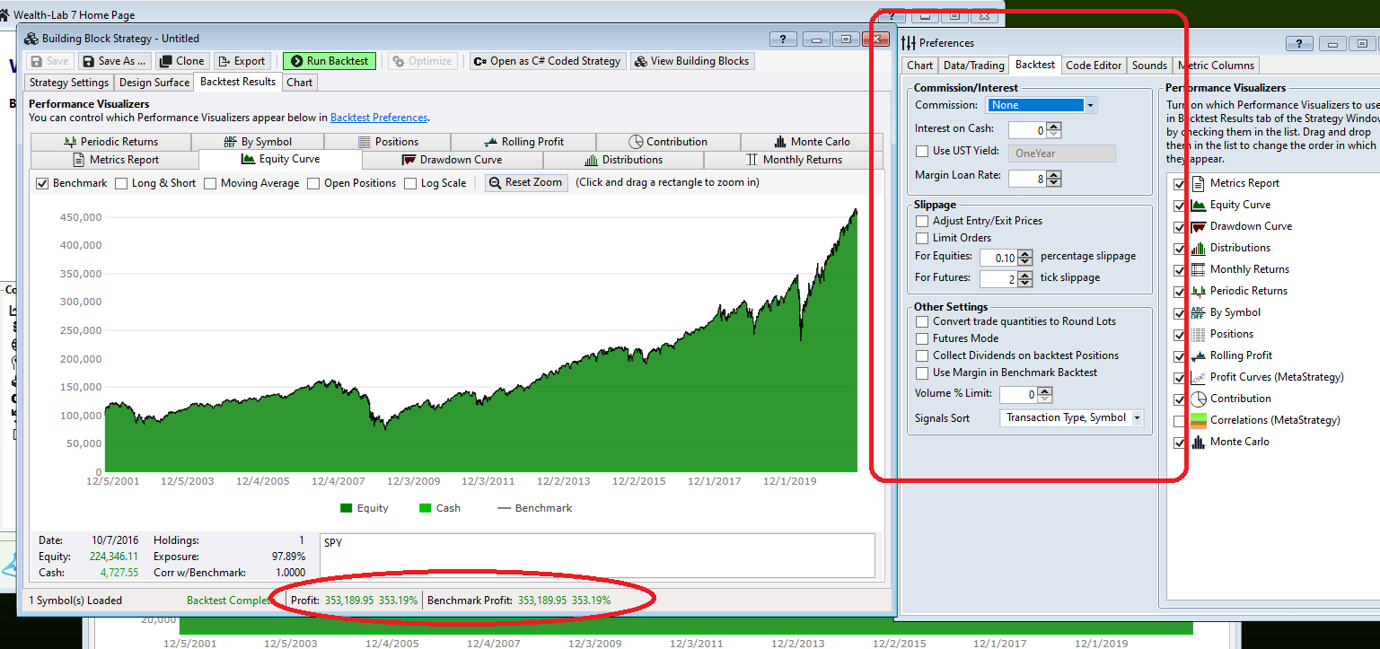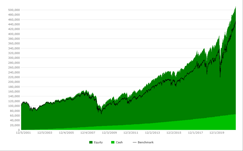 Here's my 20-year SPY simulation with dividends vs. SPY benchmark -