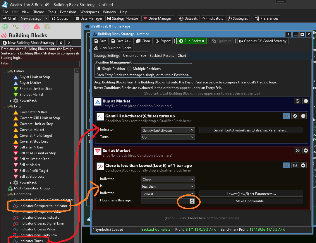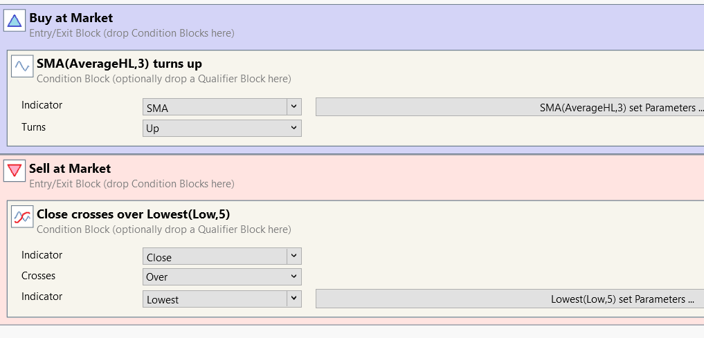 3. Choose "Indicator Turns" for the entry, taking the 3-period SMA of AveragePriceHL (instead of Close).