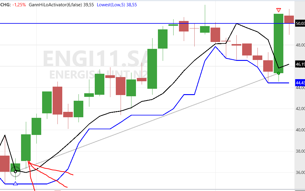 1. The Gann HiLo Activator is a simple moving average of the previous three periods highs or lows. Based on the moving averages logic, it is a trend-following indicator used to reflect the markets direction of movement.