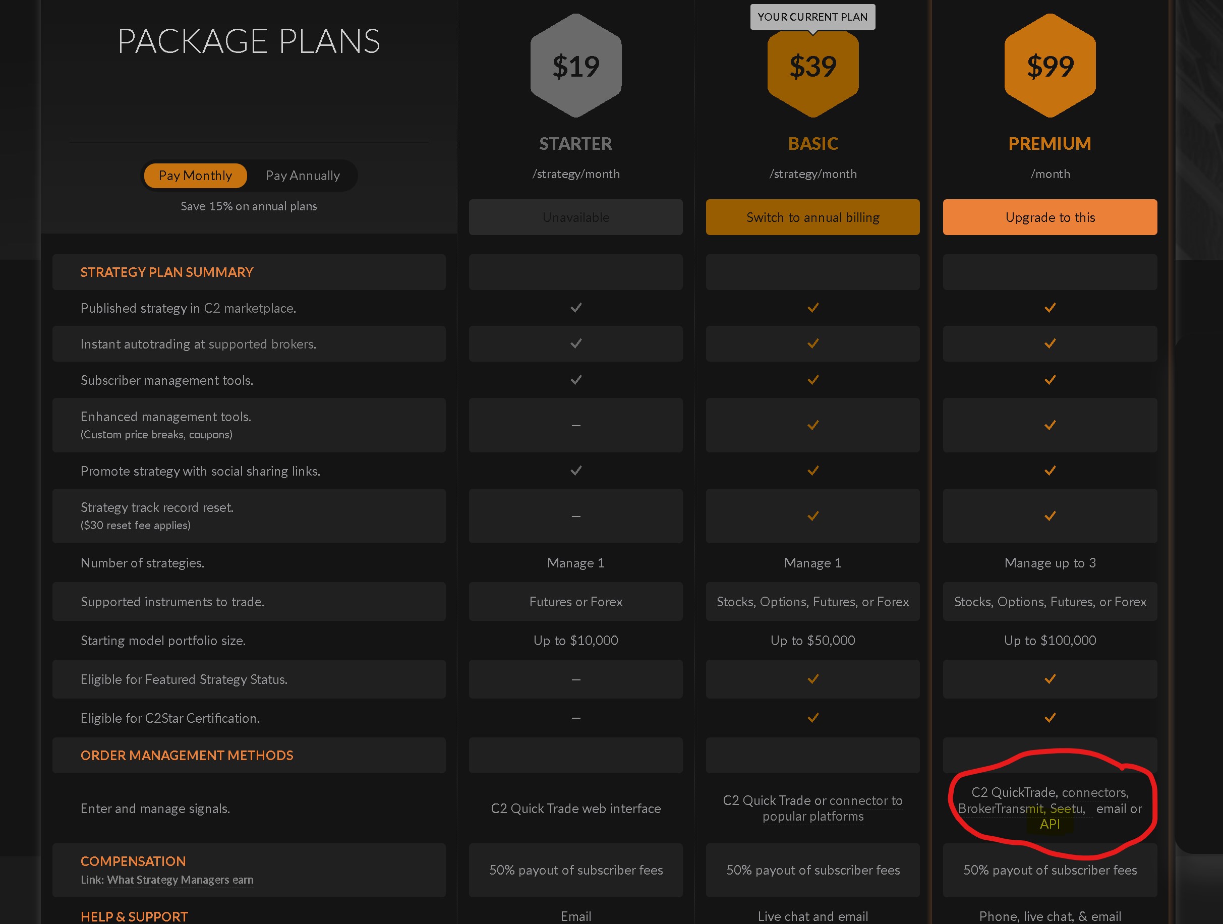 Your original title (C2 Requiring Premium Account for API Auto Trade) suggests that a Premium Account is required. That's false.