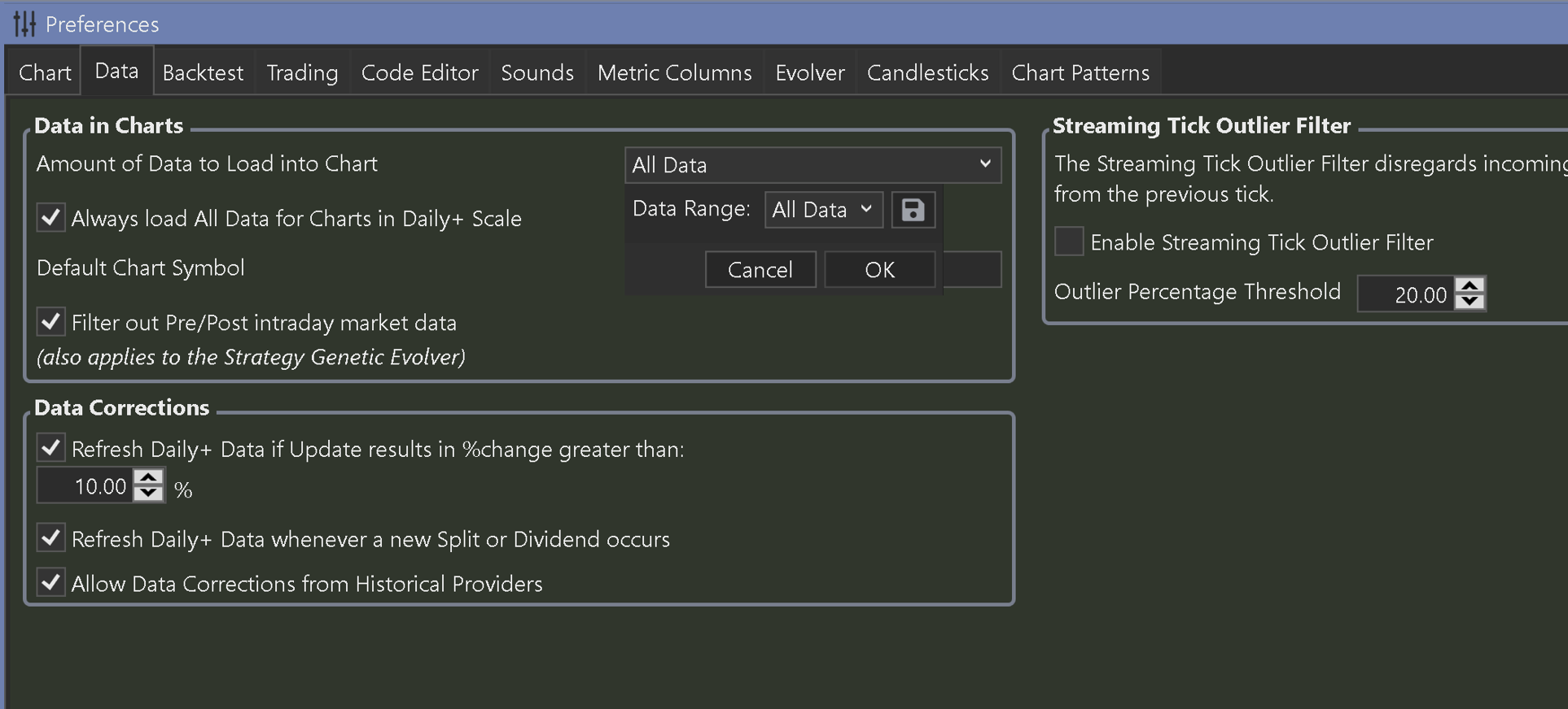 You can always change the chart's data range later, and, when you're backtesting you can set any data range you like, separately. But defaulting to "All Data" for intraday charts is a bad idea, generally. I'd recommend changing that to 1000 or 2000 bars.