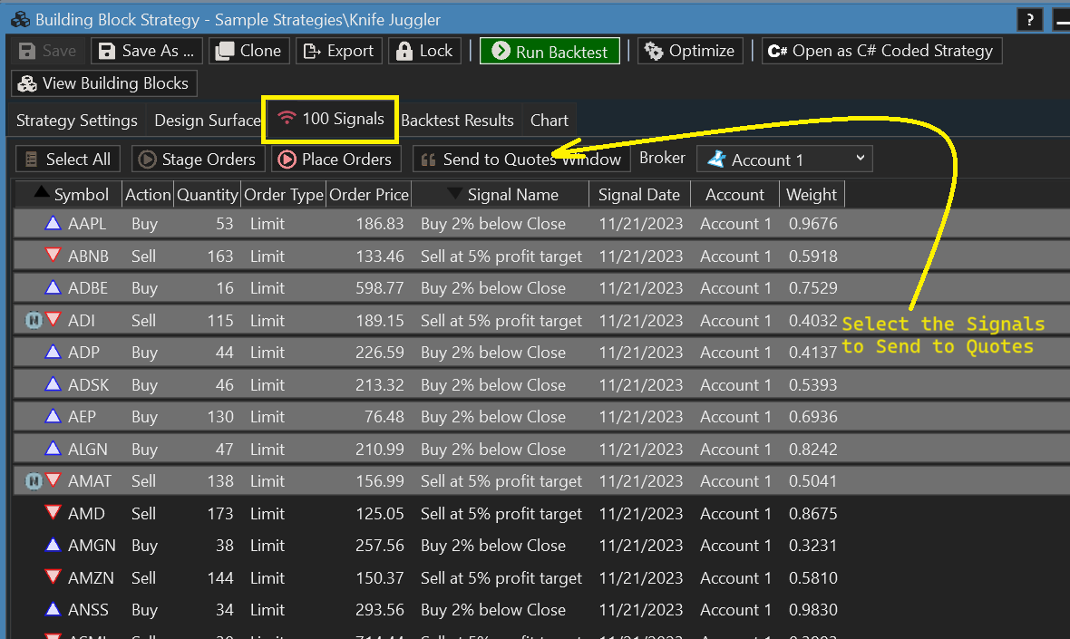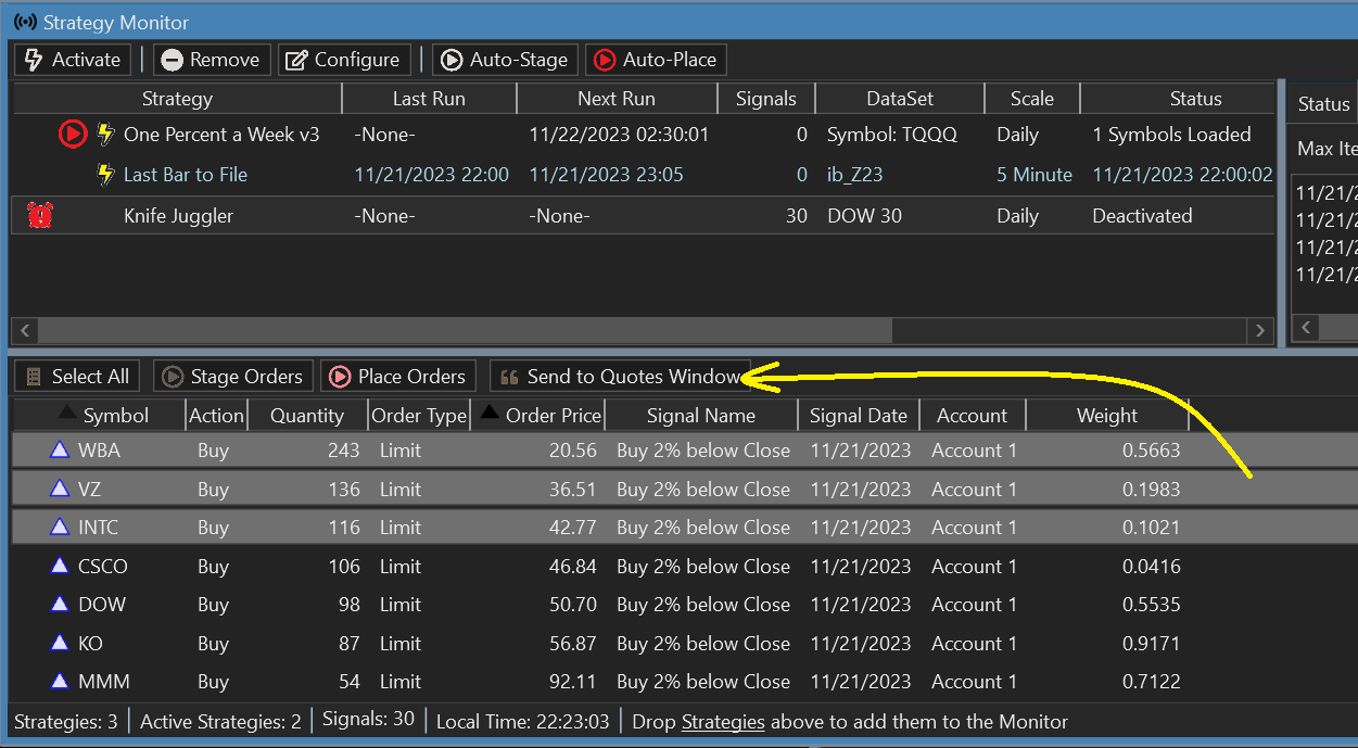 And the Strategy Monitor has a Signals pane for the selected Strategy item -